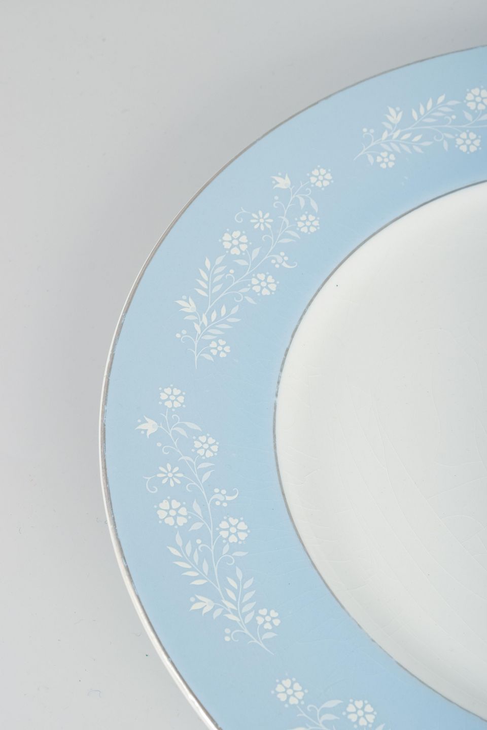 Set of six earthenware dinner plates with a blue border decorated with white flowers and a silver rim.