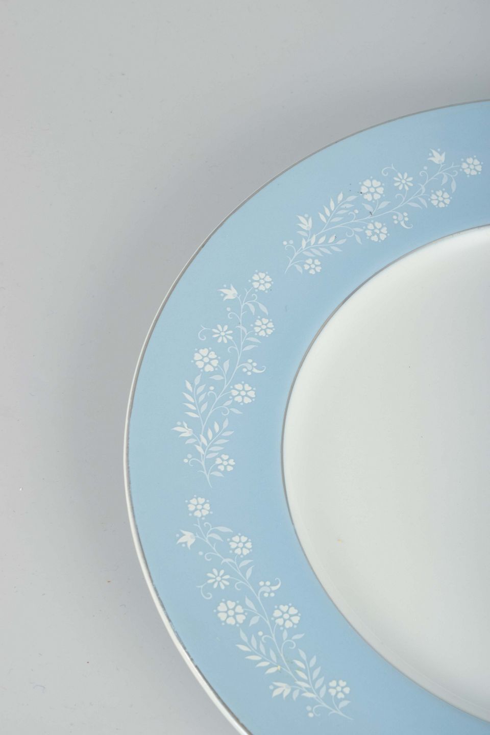 Set of six earthenware dinner plates with a blue border decorated with white flowers and a silver rim.