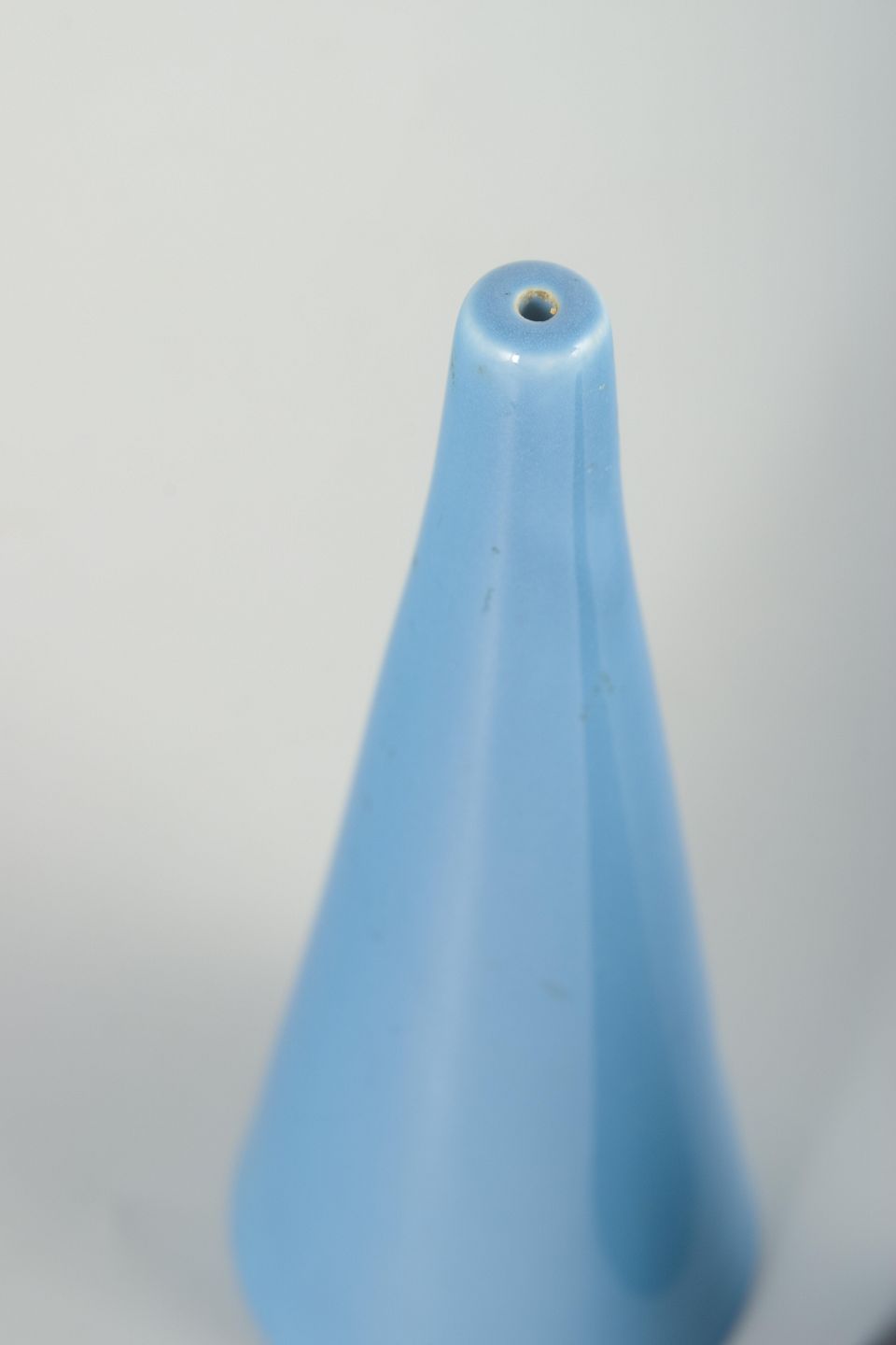 Pair of conical salt and pepper shakers in glazed faience, with blue and black glaze.