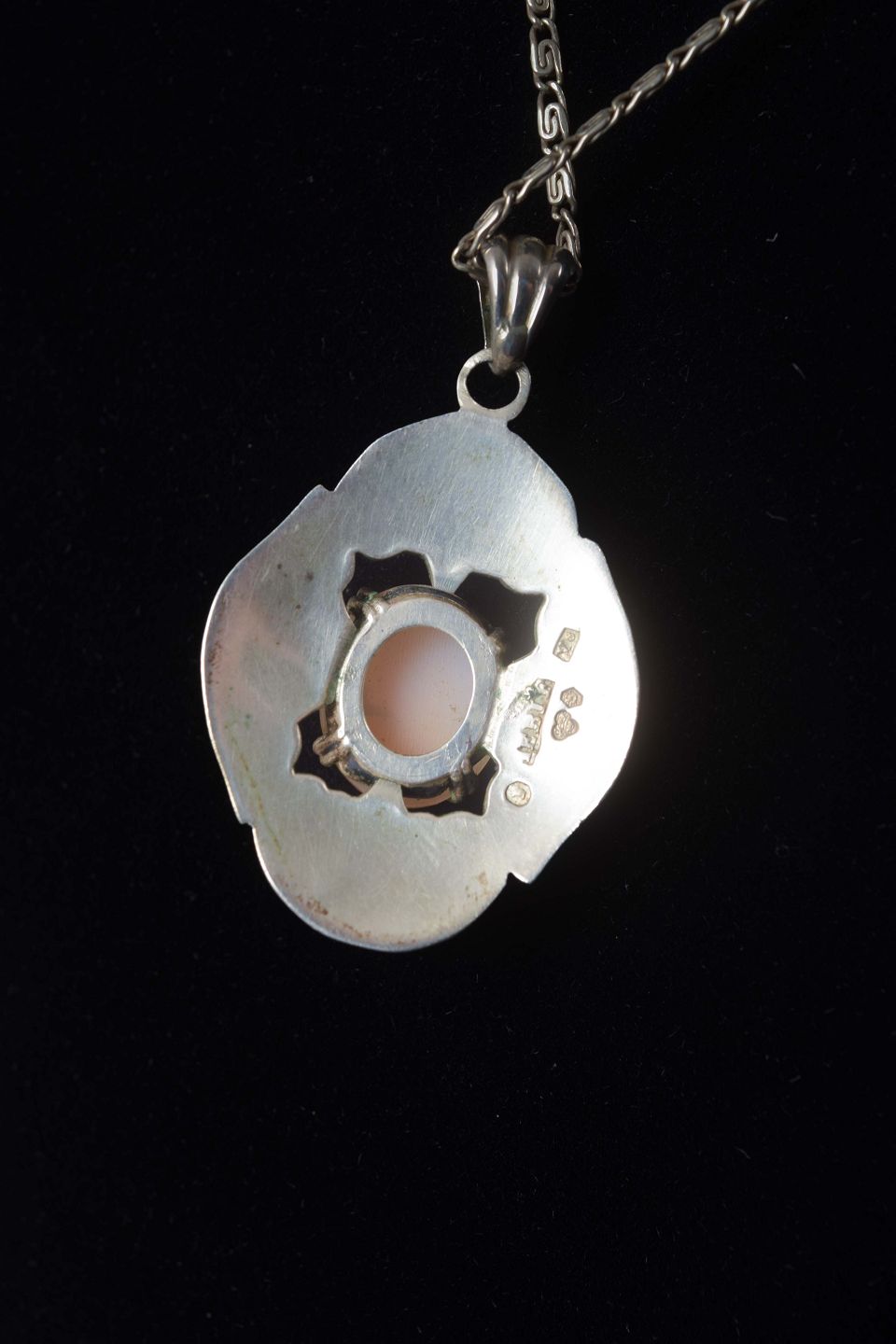 Silver necklace with pendant, finely crafted with a classical cameo and floral ornamentation.