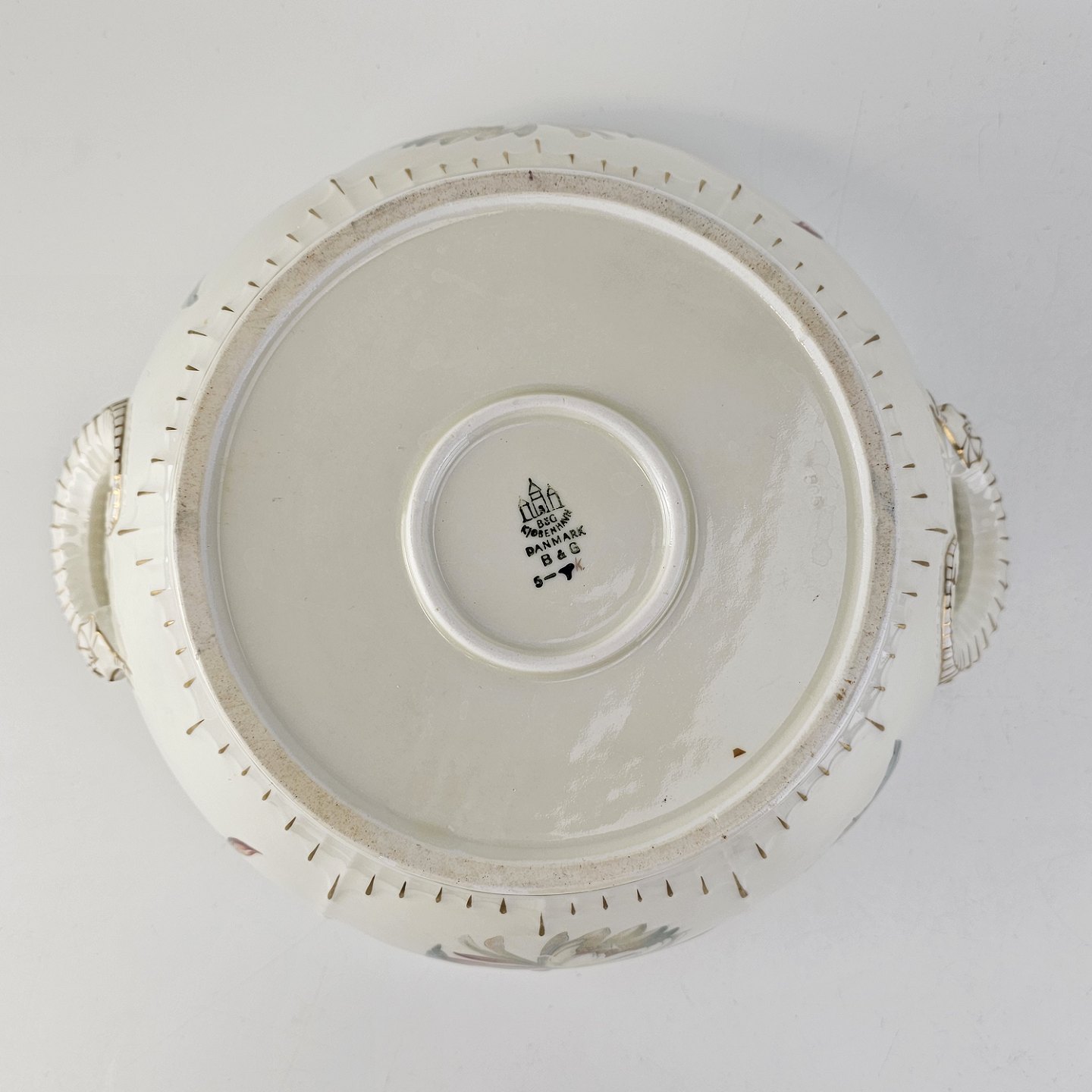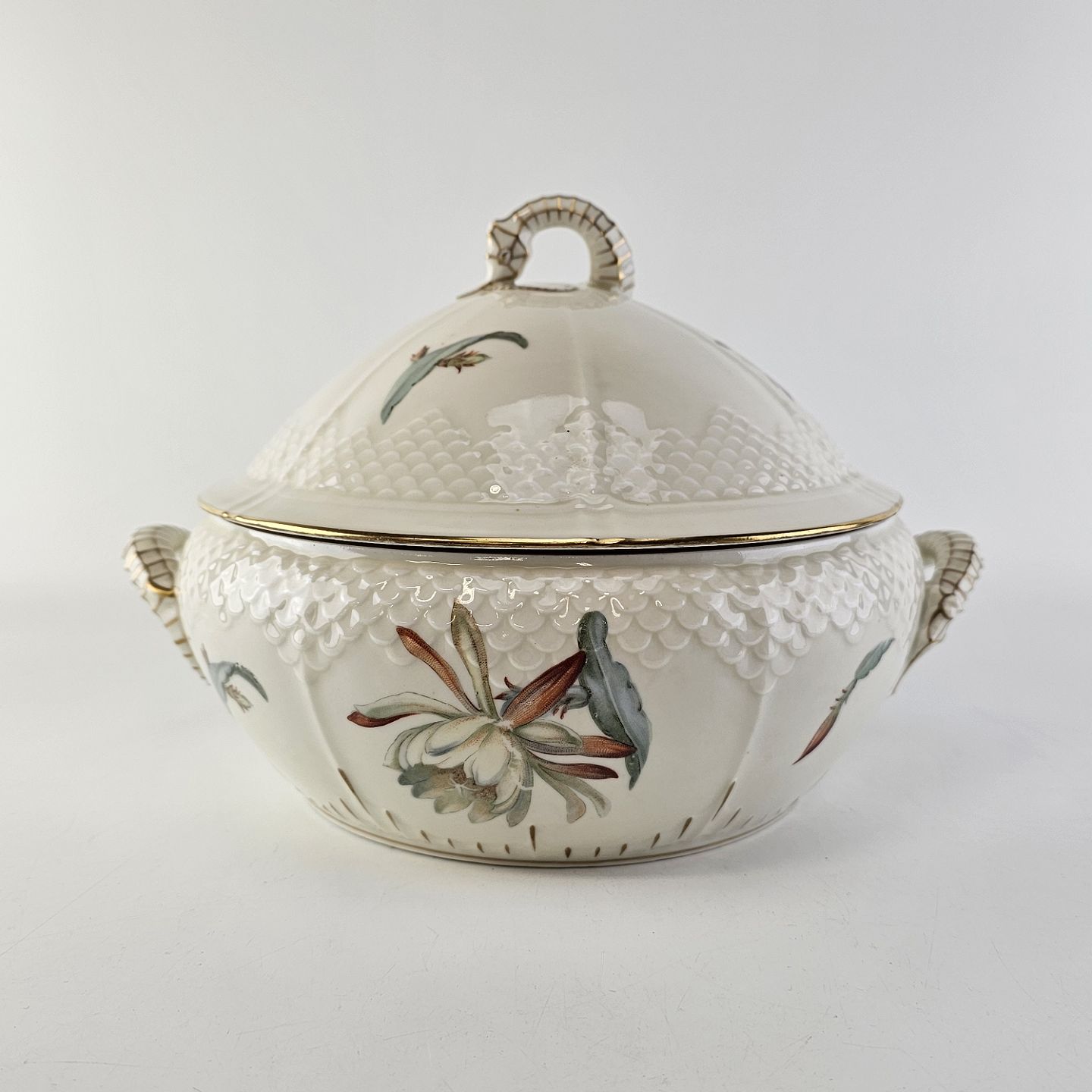 Kaktus er cremefarvet porcelæn i skælform, dekoreret med kaktusblomster og guldkant