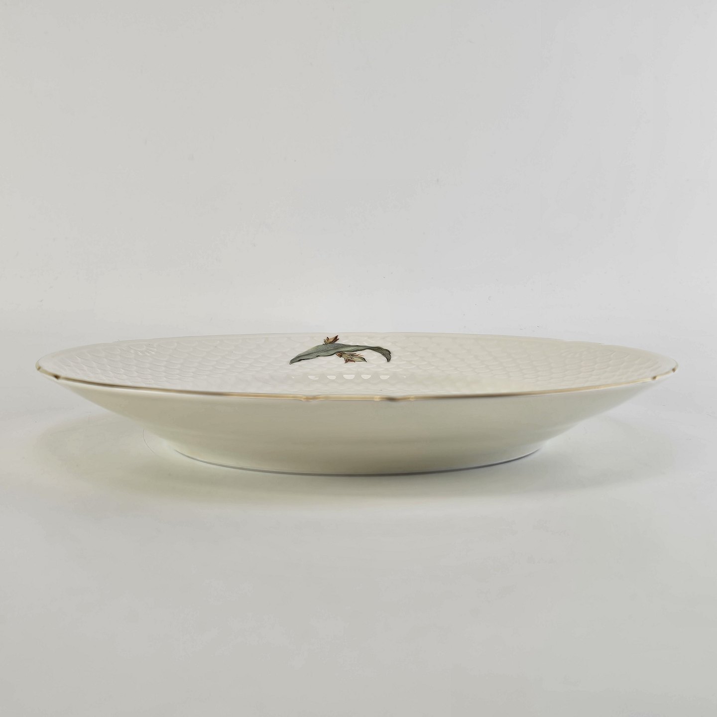 Kaktus er cremefarvet porcelæn i skælform, dekoreret med kaktusblomster og guldkant