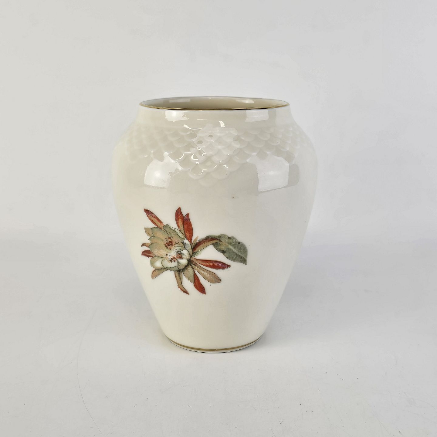 Kaktus er cremefarvet porcelæn i skælform, dekoreret med kaktusblomster og guldkant