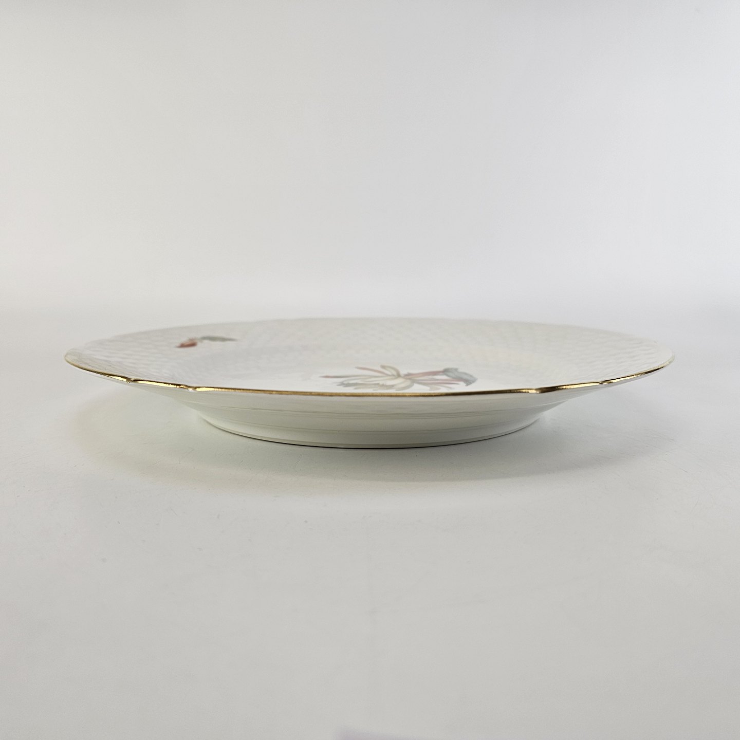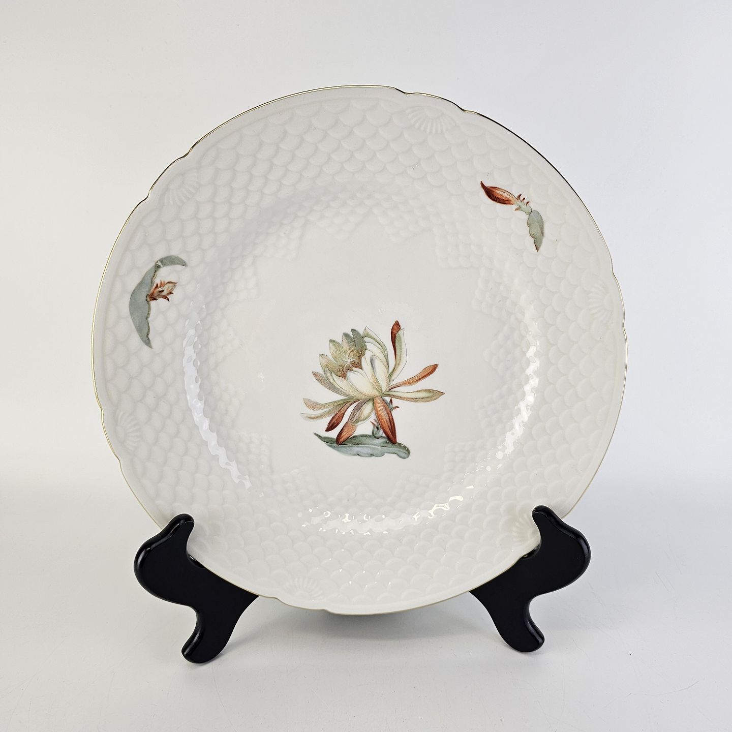 Kaktus er cremefarvet porcelæn i skælform, dekoreret med kaktusblomster og guldkant