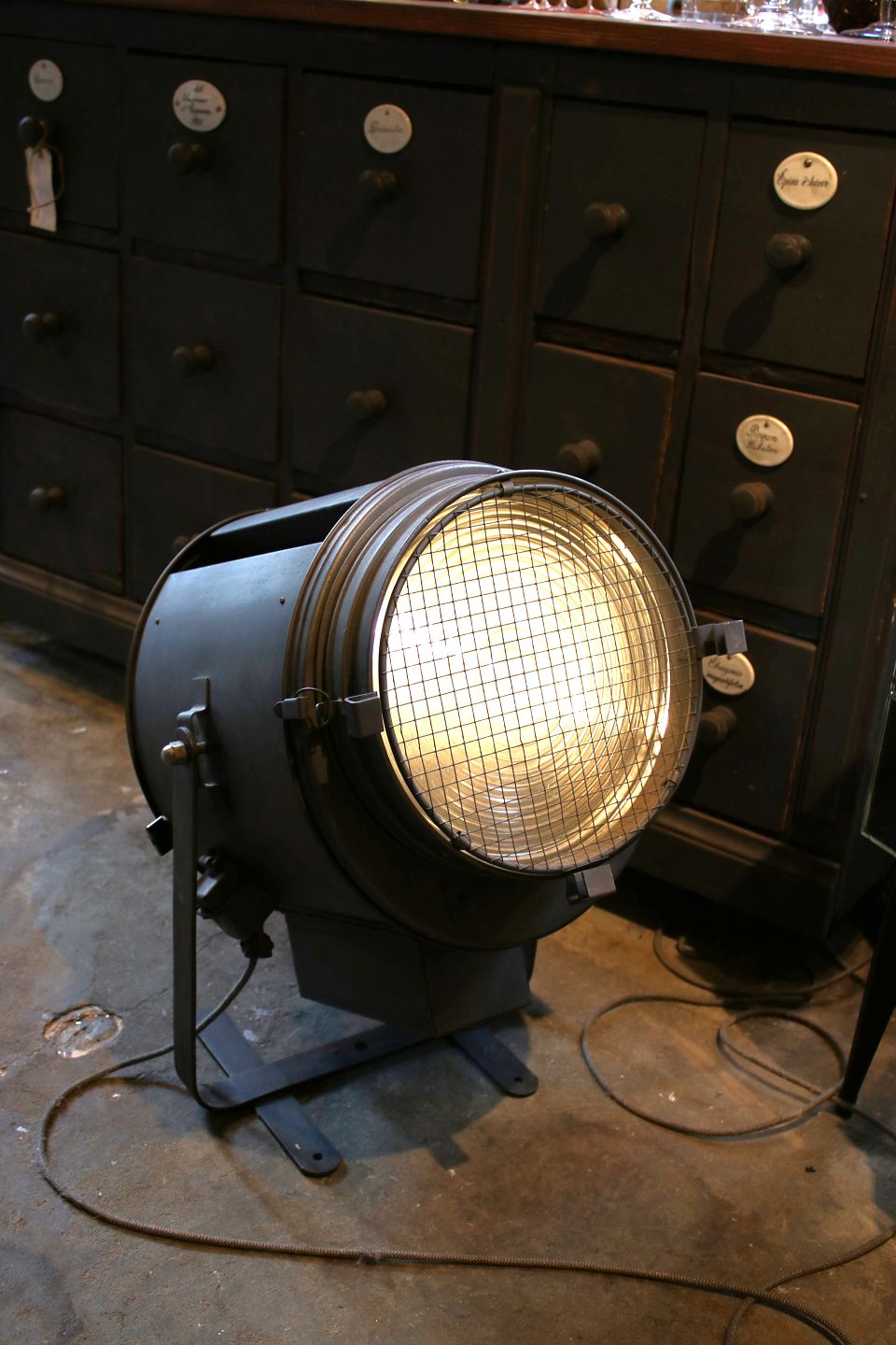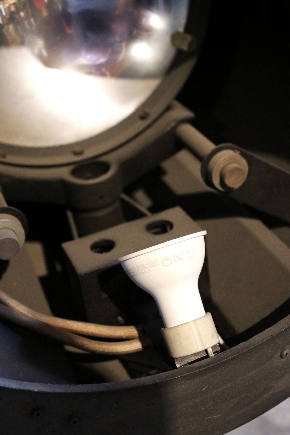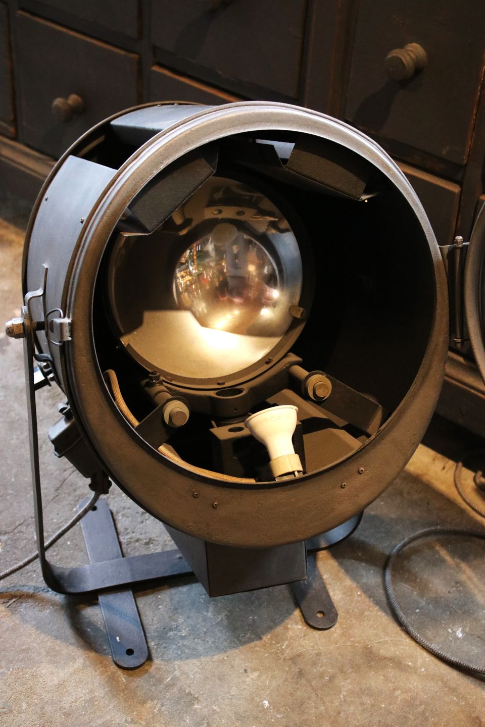 The old Industrial light bulb has been replaced with a halogen lamp