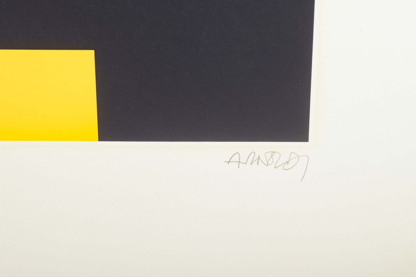 Abstract composition consisting of overlapping geometric shapes in yellow, red, and blue on a black background. The strong contrast between the colors and the simple, architectural elements emphasizes Arnoldi’s characteristic minimalist style.