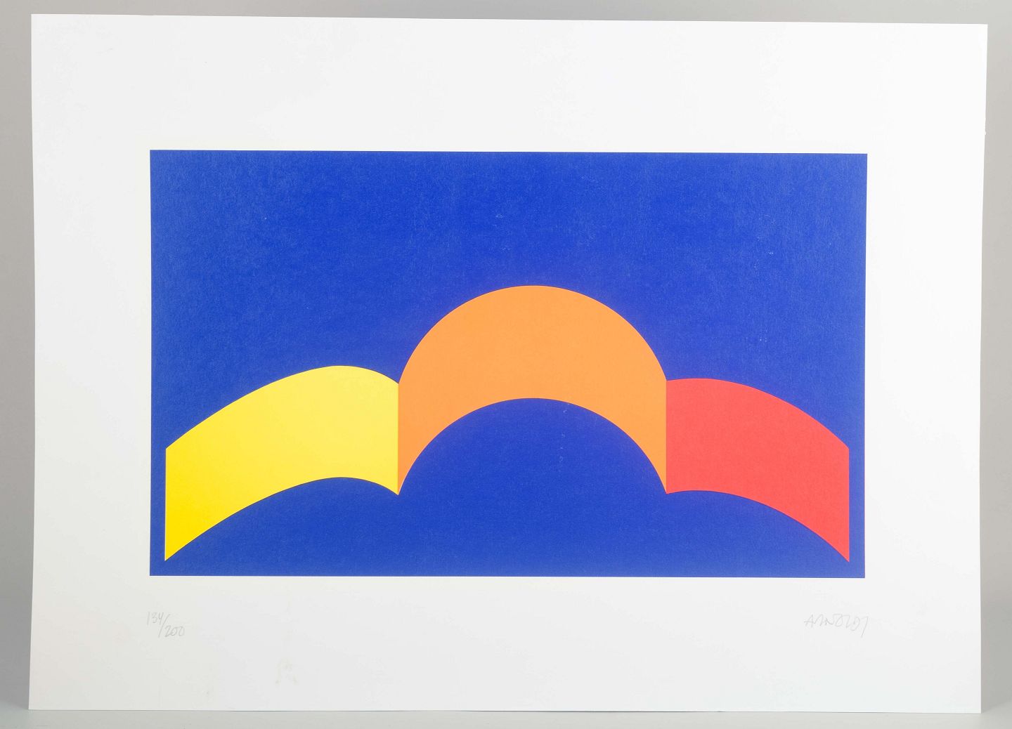 Graphic composition in clear primary colors, where yellow, orange, and red curved forms create a rhythmic contrast against an intense blue background. The work shows Arnoldi’s characteristic minimalist language, focusing on clean lines, strong color fields, and simplicity.