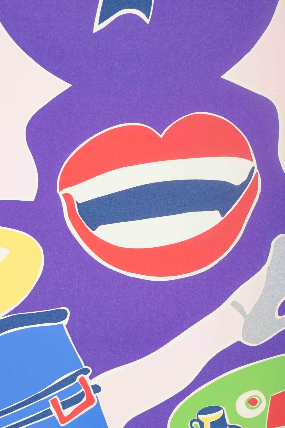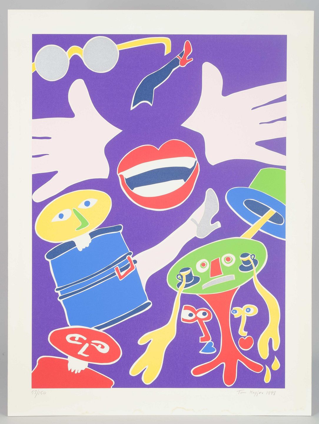 Playful and imaginative composition with surreal figures, hands, a mouth, and stylized heads in vibrant contrasting colors. The work reflects Krøjer’s distinctive visual language influenced by pop art, humor, and visual poetry, where flatness and figures are broken into a lively and narrative whole.
