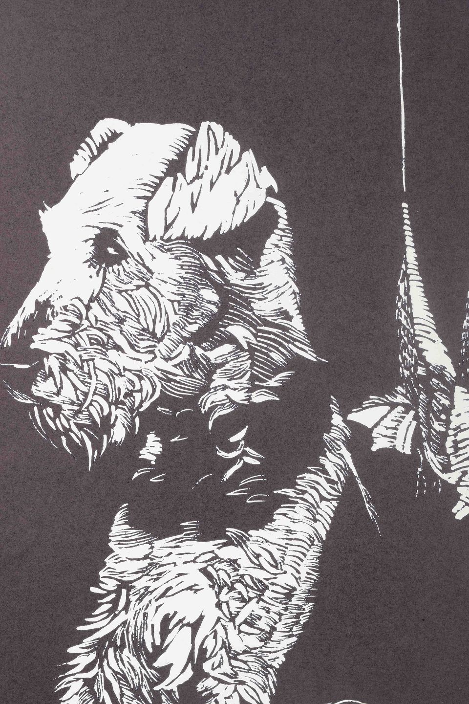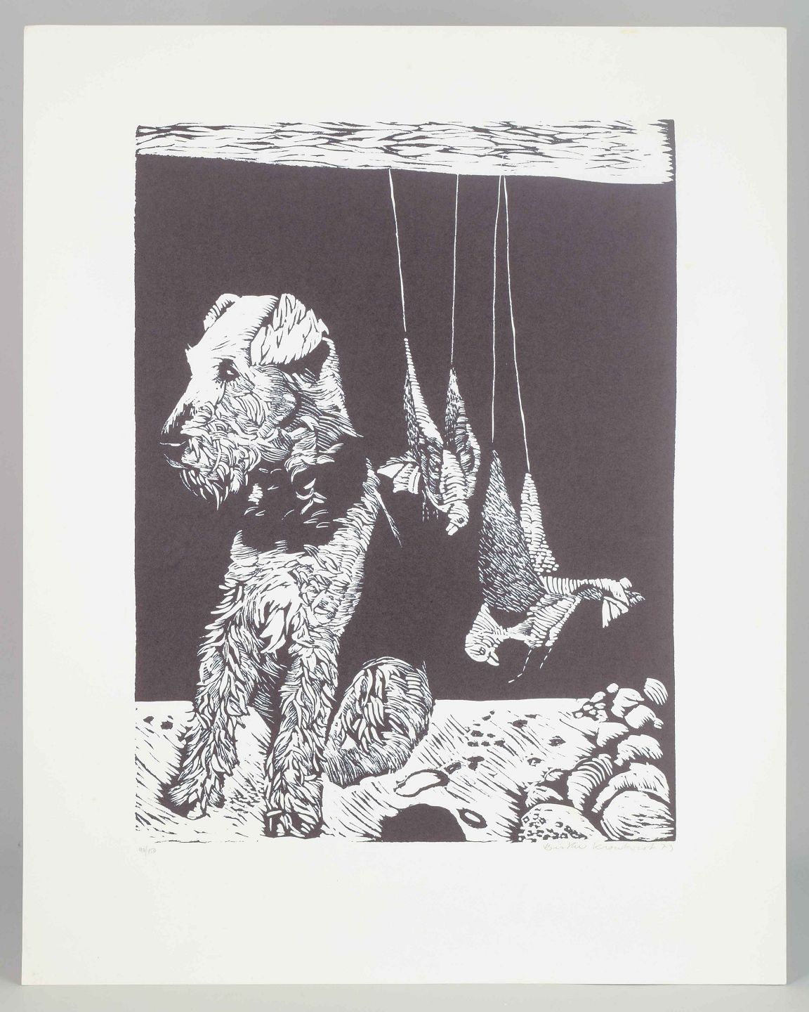 Black-and-white color lithograph depicting a terrier-like dog sitting beside hanging game. The composition combines naturalistic detail with graphic contrast in a simple, stylized manner.