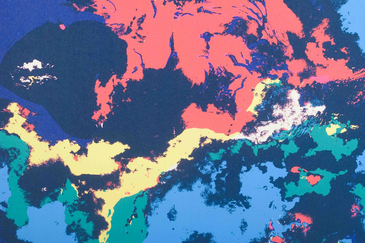 An expressive abstract print with organic, color-saturated fields in blue, red, green, and yellow tones. The composition is characterized by rhythmic movements and contrasts, creating a vibrant and dynamic surface, typical of Ernst’s exploration of colors and organic expressions.