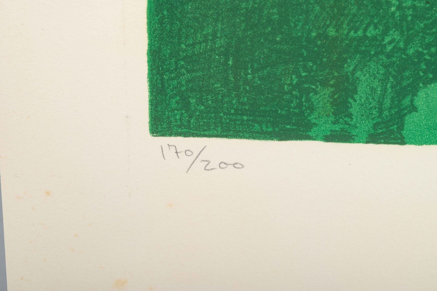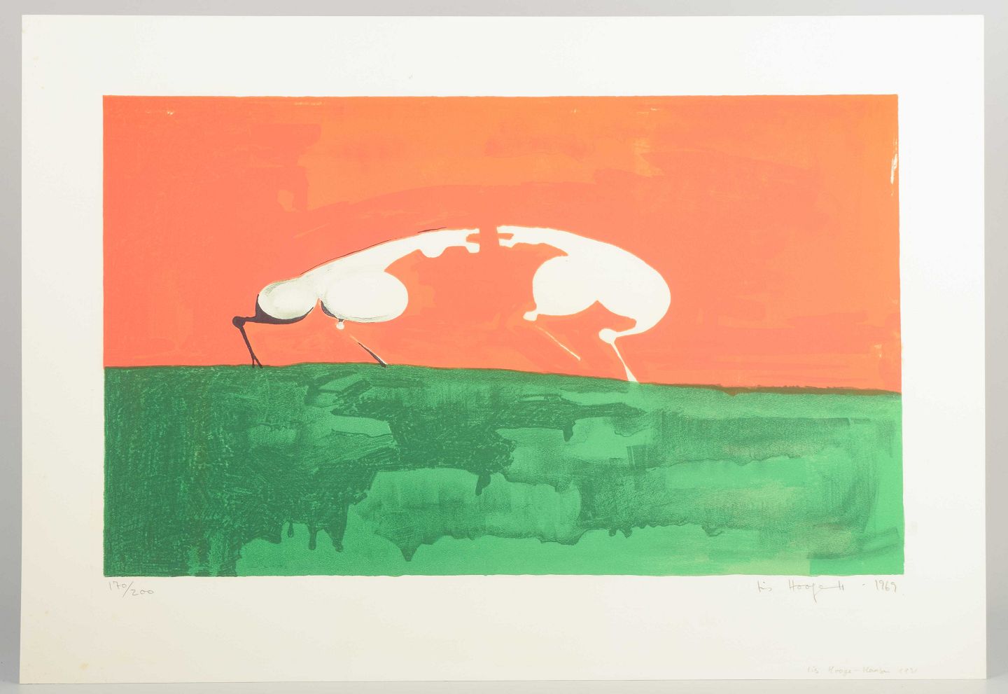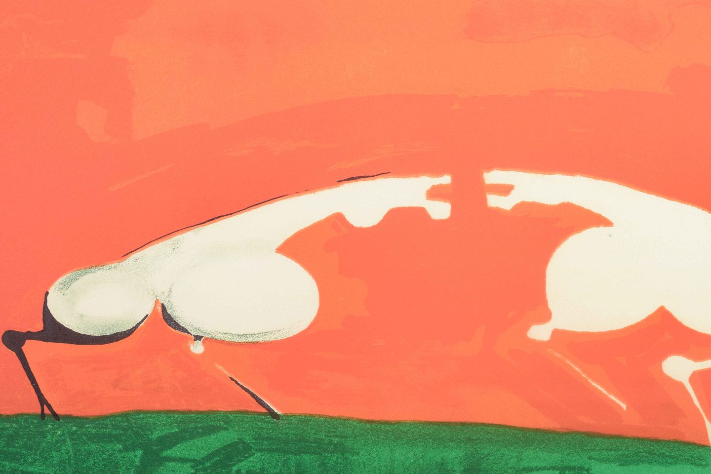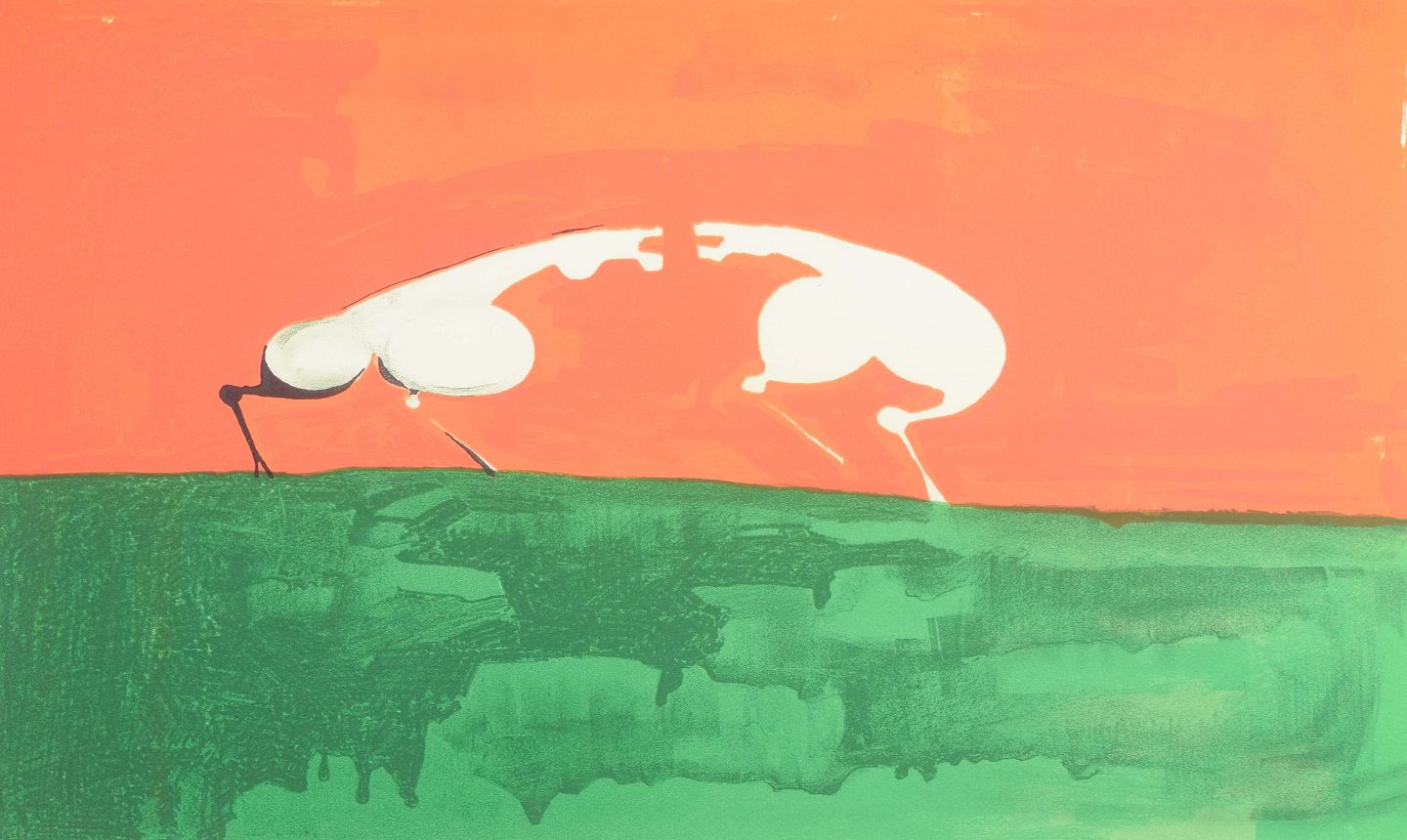 Two stylized birds in white silhouette, set against a vivid orange background and a green foreground. The simple yet striking color contrast creates a dynamic and poetic atmosphere. The work is numbered 170/200 and signed and dated 1969.