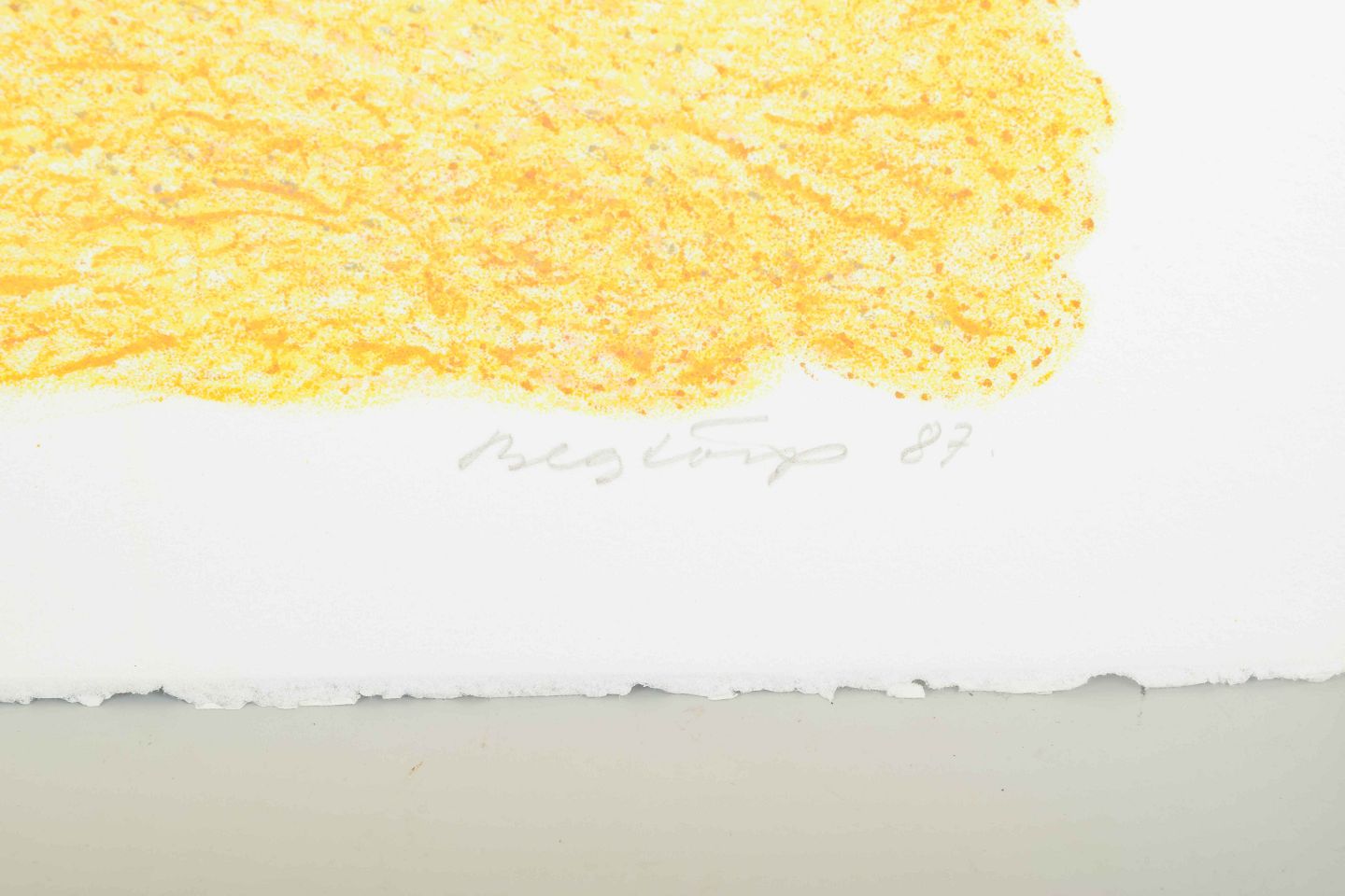 Abstract color lithograph with organic, flowing forms in yellow and golden tones suggesting a lyrical landscape.