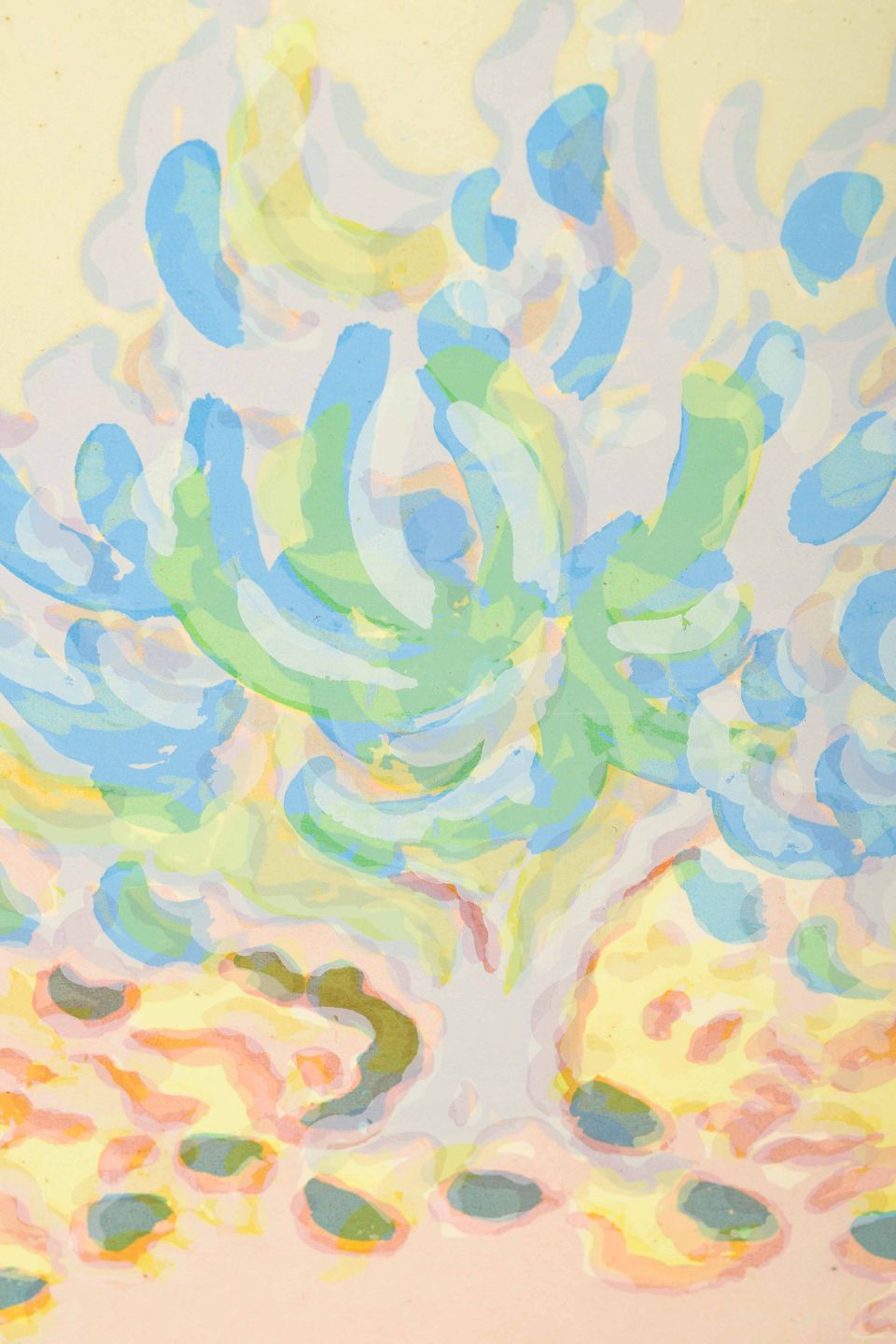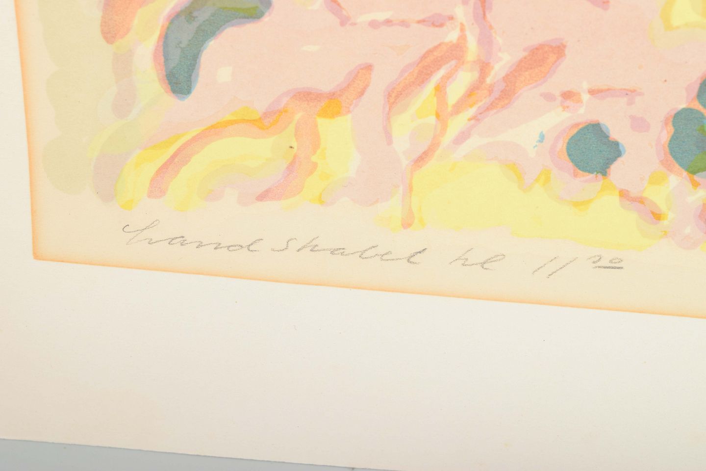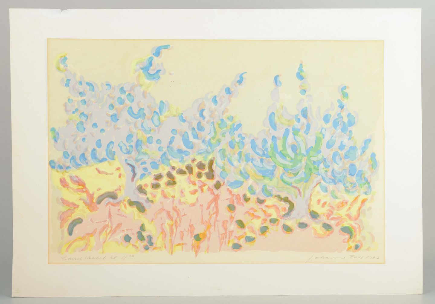 A poetic and colorful color lithograph with organic and abstract forms in blue, green, pink, and yellow tones. The work has a light and dreamlike character, where the brushstrokes form rhythmic patterns suggesting a landscape in motion.