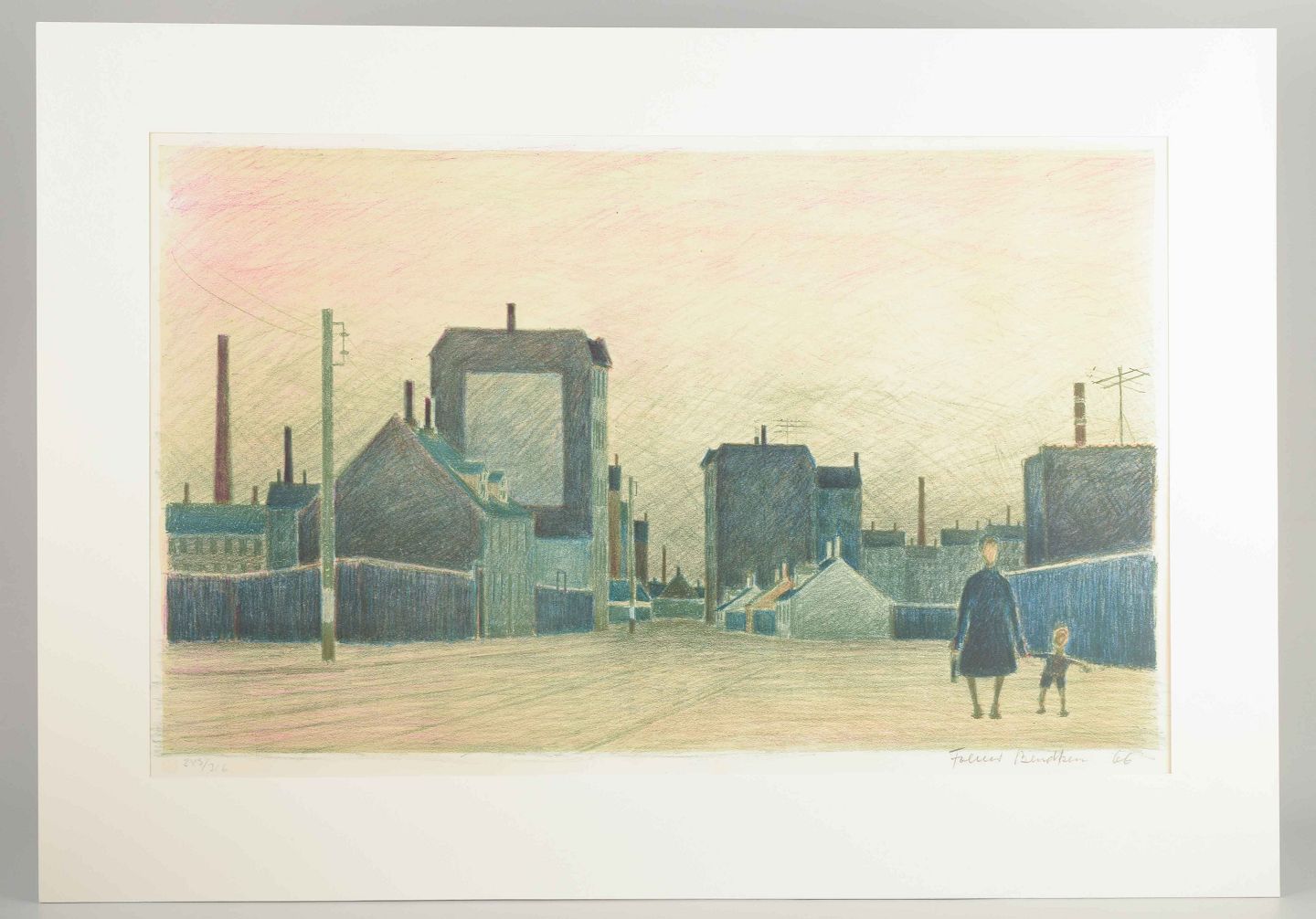 A characteristic scene from the working-class district, where the open square is framed by factory buildings, chimneys, and utility poles. In the foreground, a woman and child emphasize the human presence within the strict architectural surroundings. The work highlights Bendtsen’s ability to capture both everyday life and the urban environment in a poetic manner.