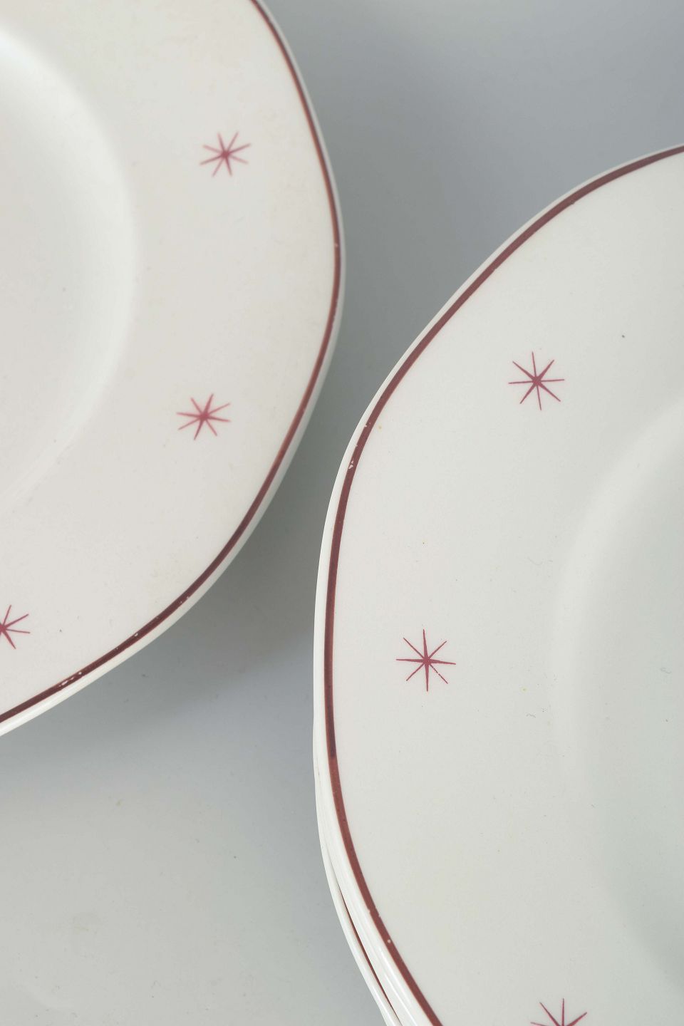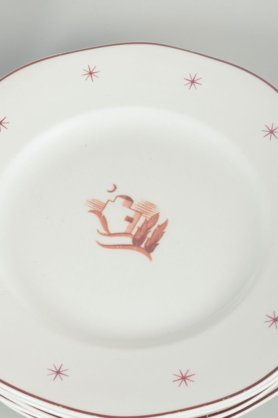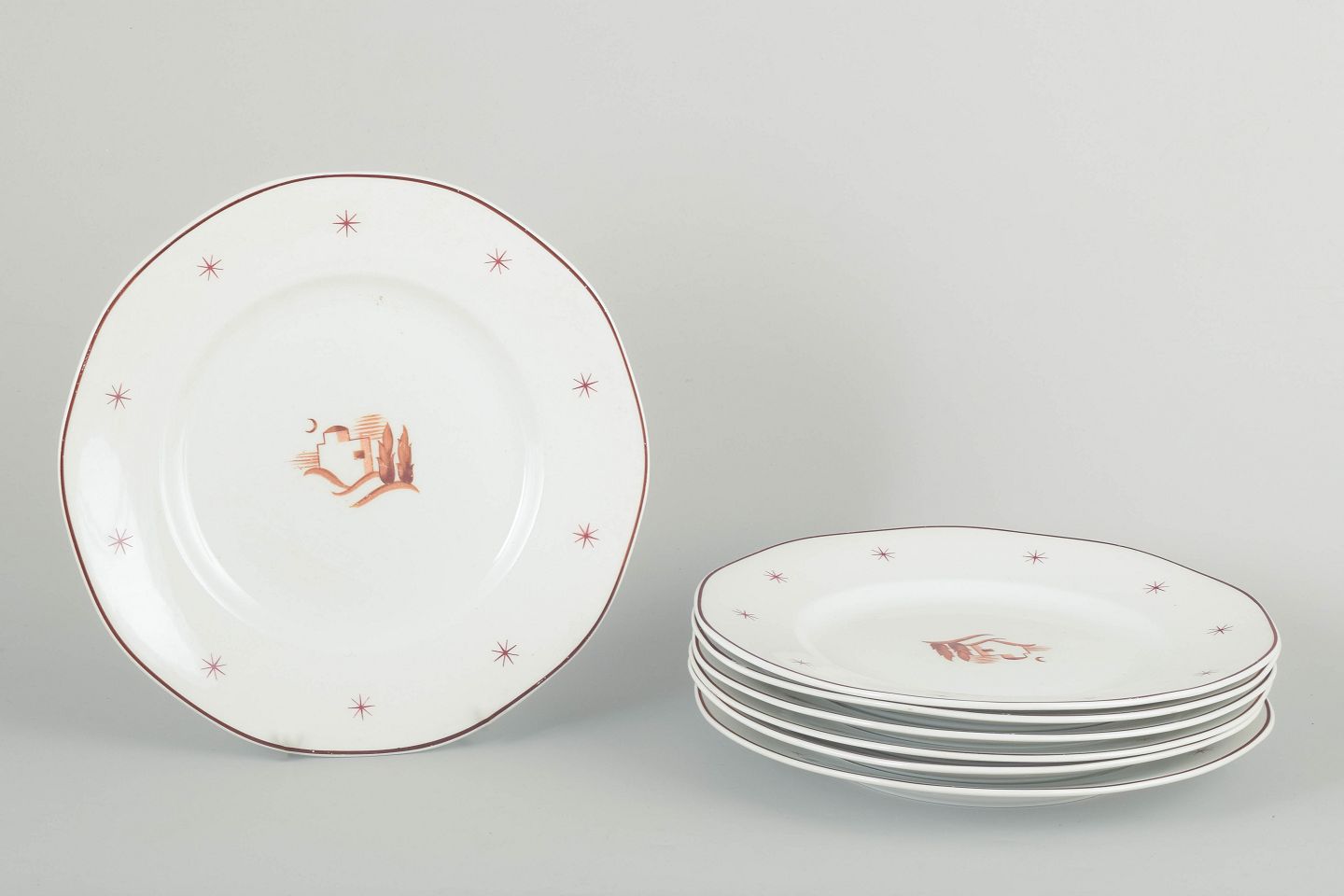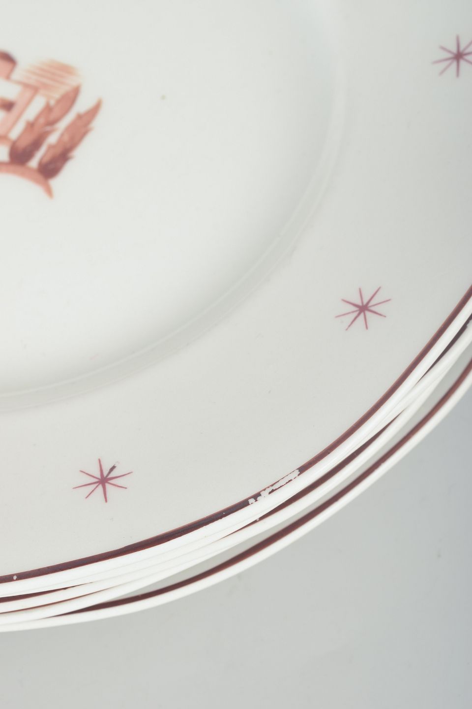 Art Deco-inspired plates in white porcelain with decoration in brown and golden tones, star ornaments along the rim, and a central motif of a house and trees.