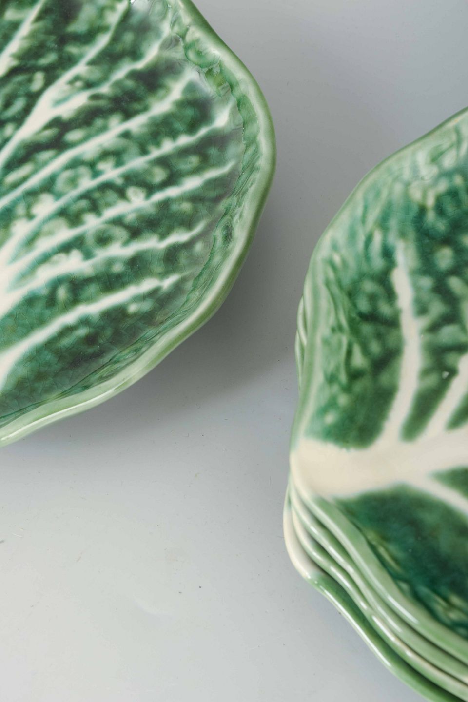 Organically shaped faience plates in majolica, made in the form of cabbage leaves with green glaze.