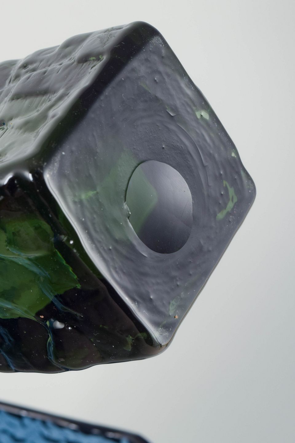 Rectangular vases in textured pressed glass, one in green and one in blue. Both with characteristic relief pattern and organic expression.