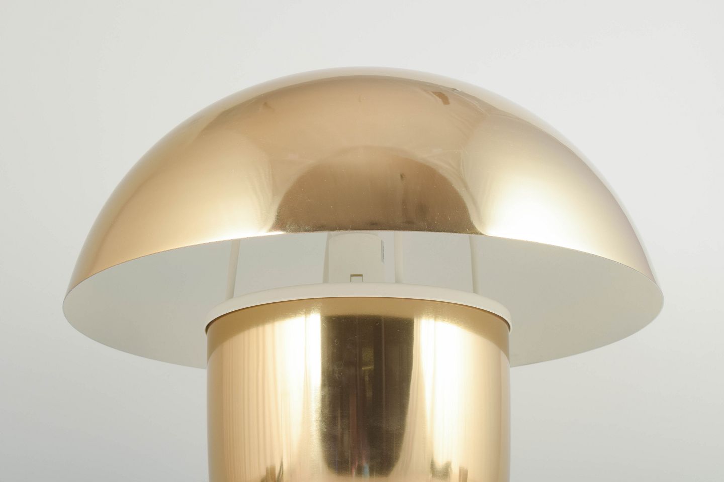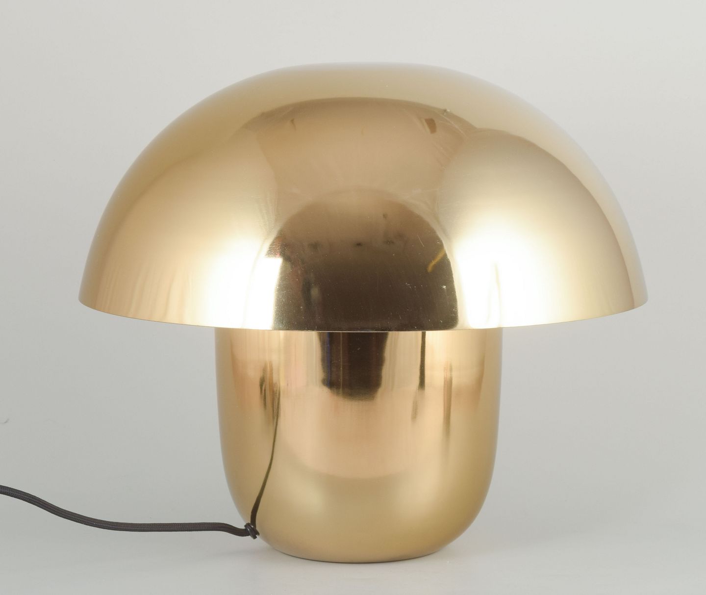 Organically shaped table lamp in polished brass-look metal with mushroom-shaped shade.