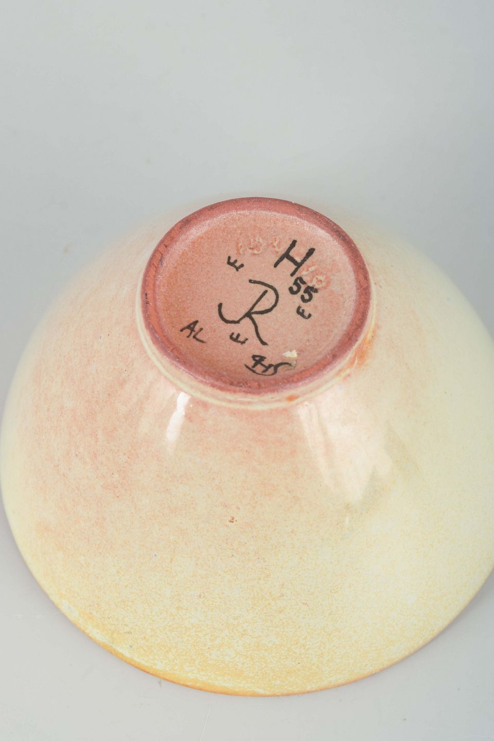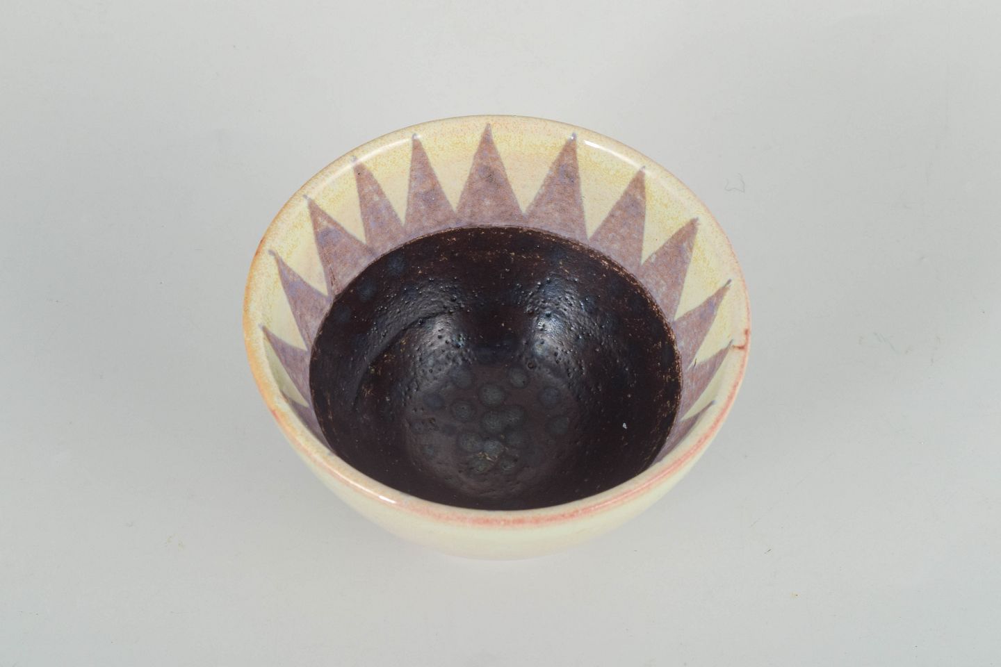 Wheel-thrown stoneware bowl with organic form, outer glaze in pink/white tones and interior decorated with dark glaze and a triangular brown pattern.
