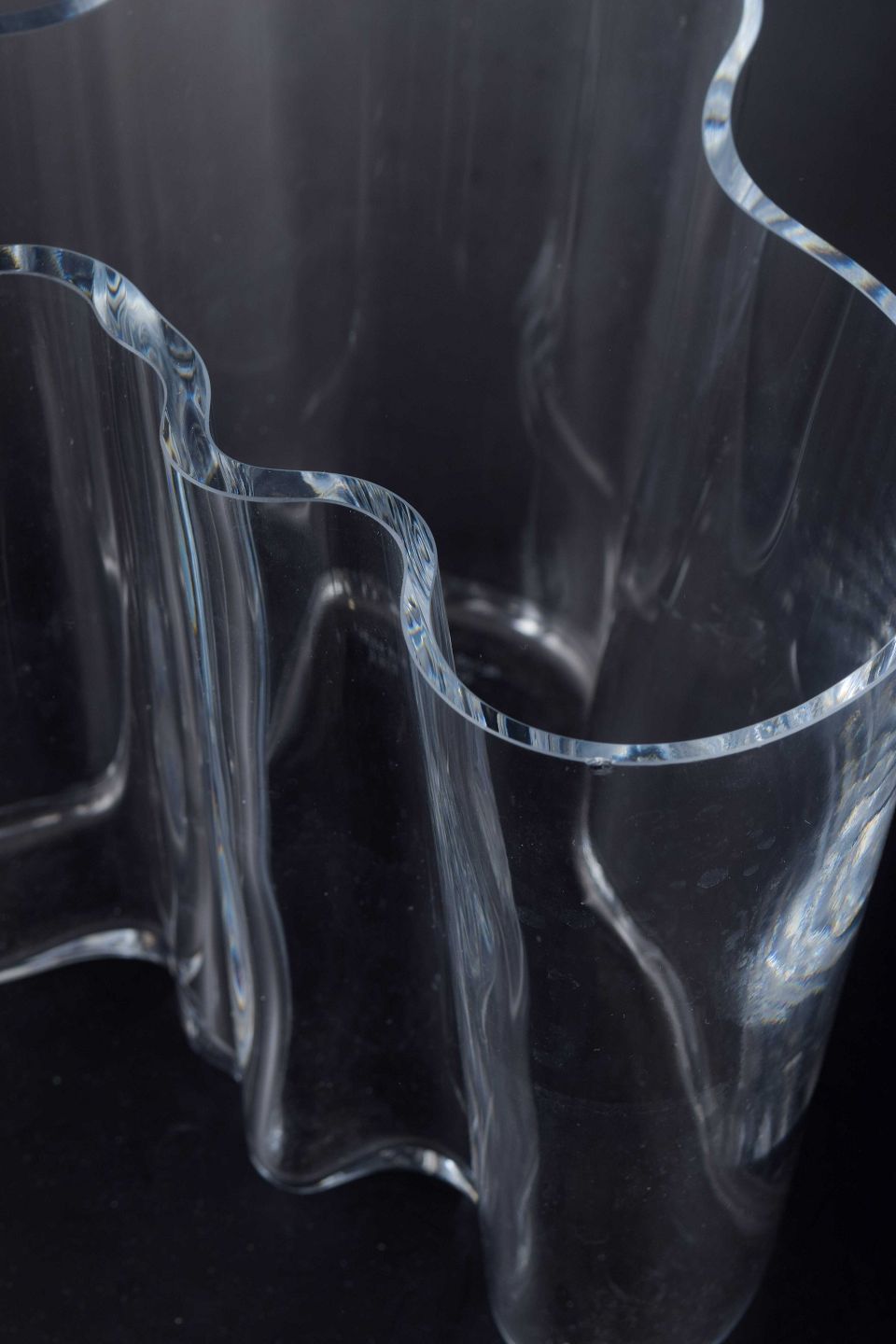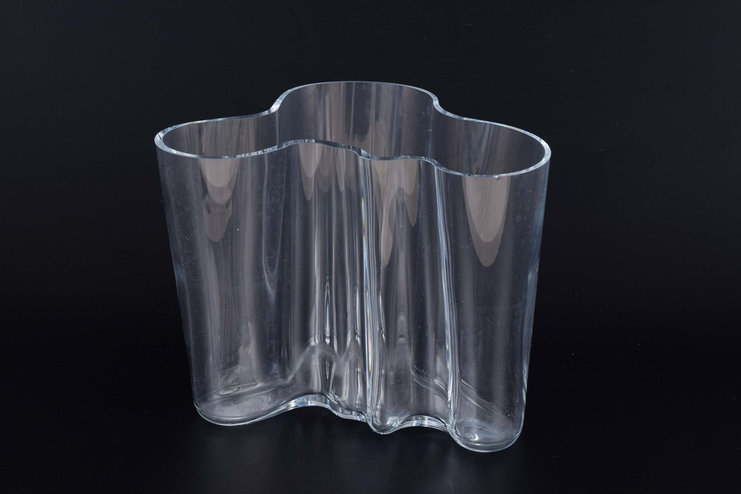 Organically shaped glass vase, known as the Savoy Vase, designed by Alvar Aalto and produced by Iittala. The iconic form with soft, flowing lines is a masterpiece of Scandinavian design history.