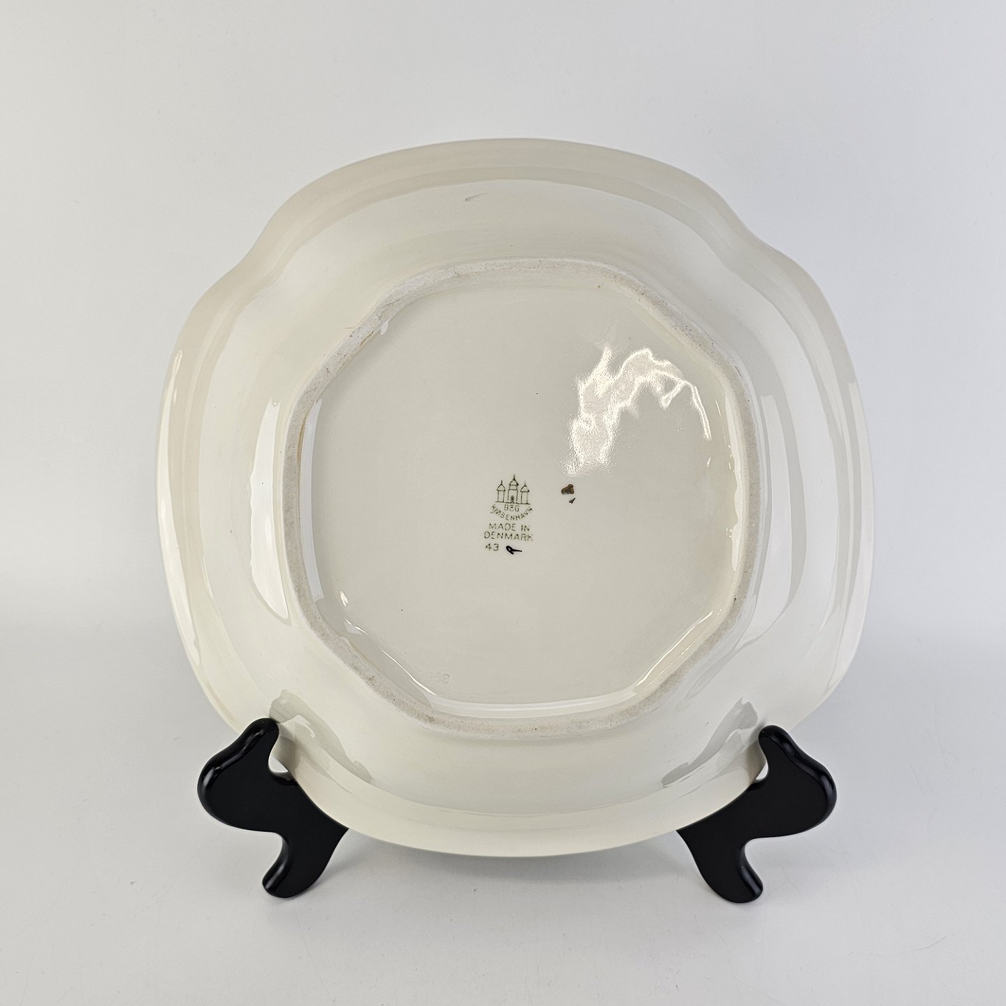 Balder er cremefarvet porcelæn i skælform, dekoreret med hyben og en guldkant.