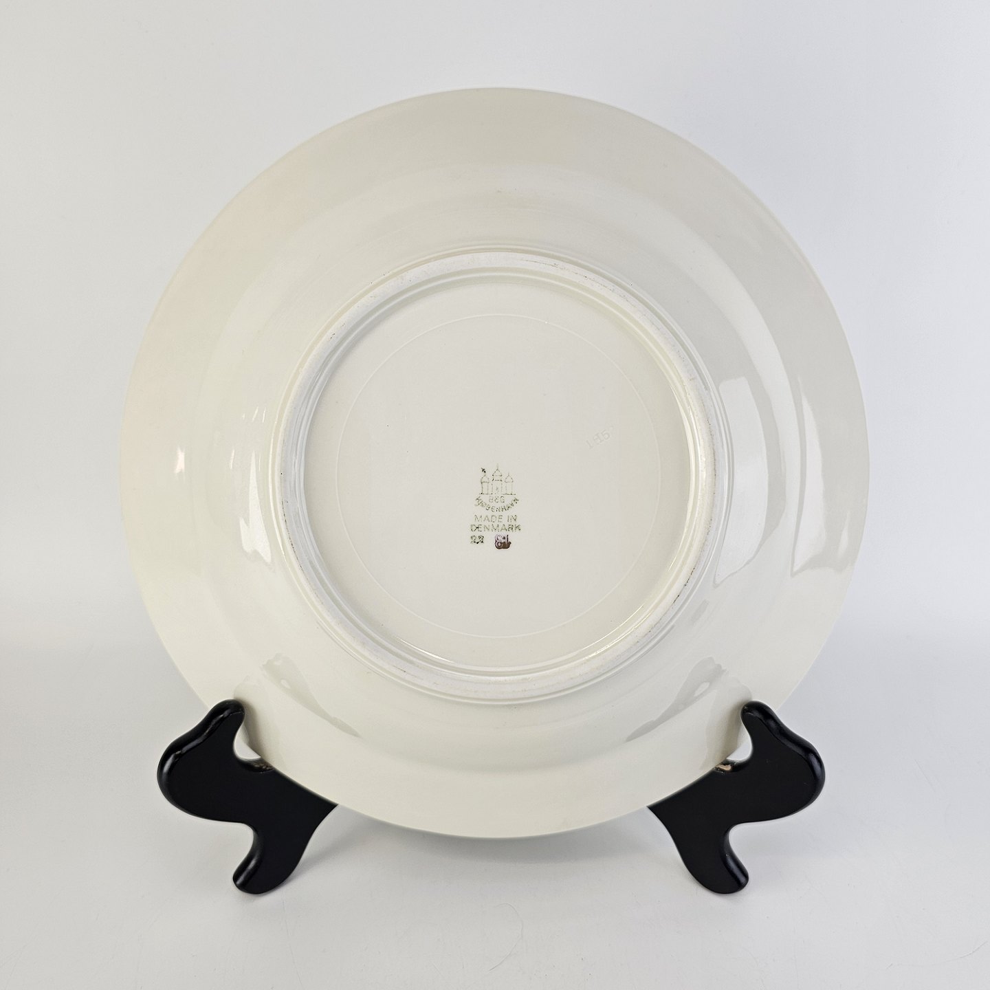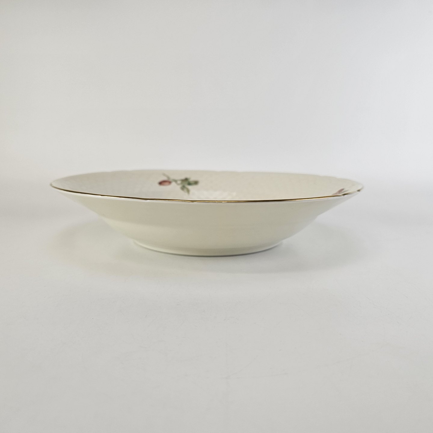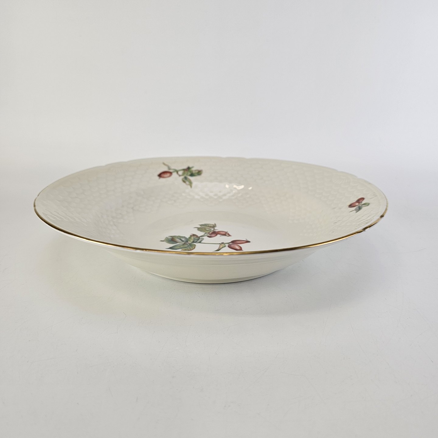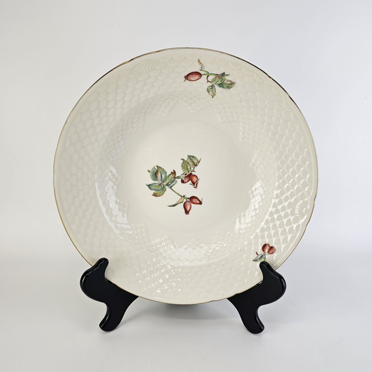 Balder er cremefarvet porcelæn i skælform, dekoreret med hyben og guldkant.