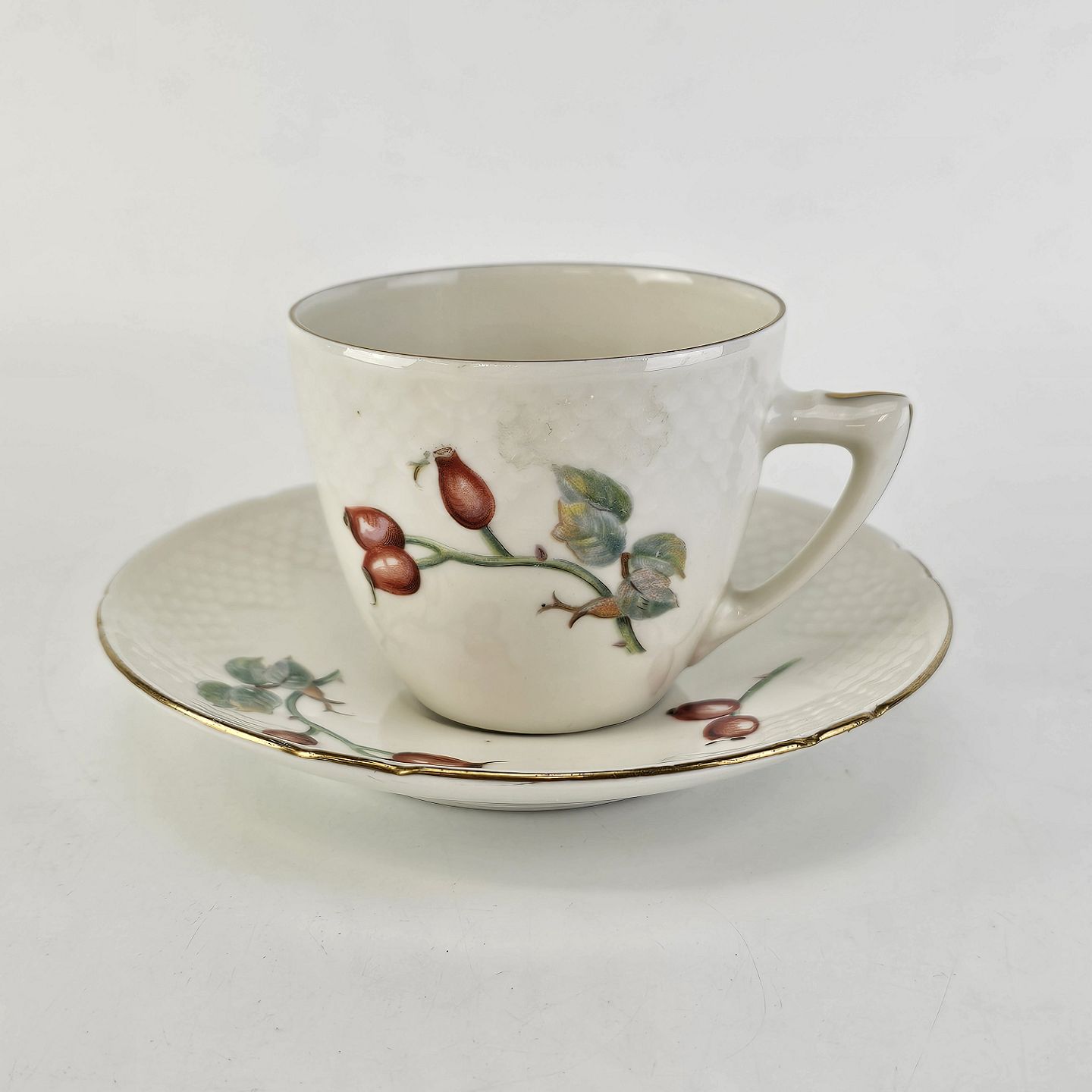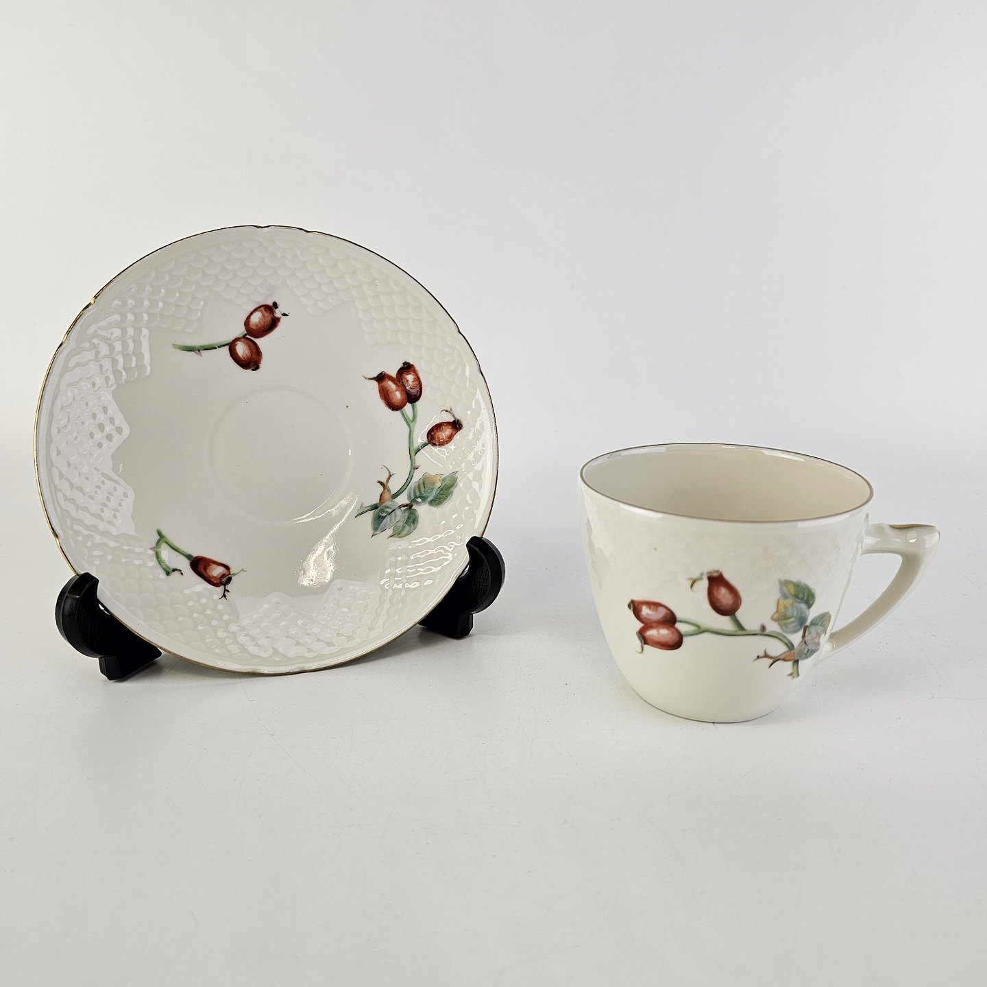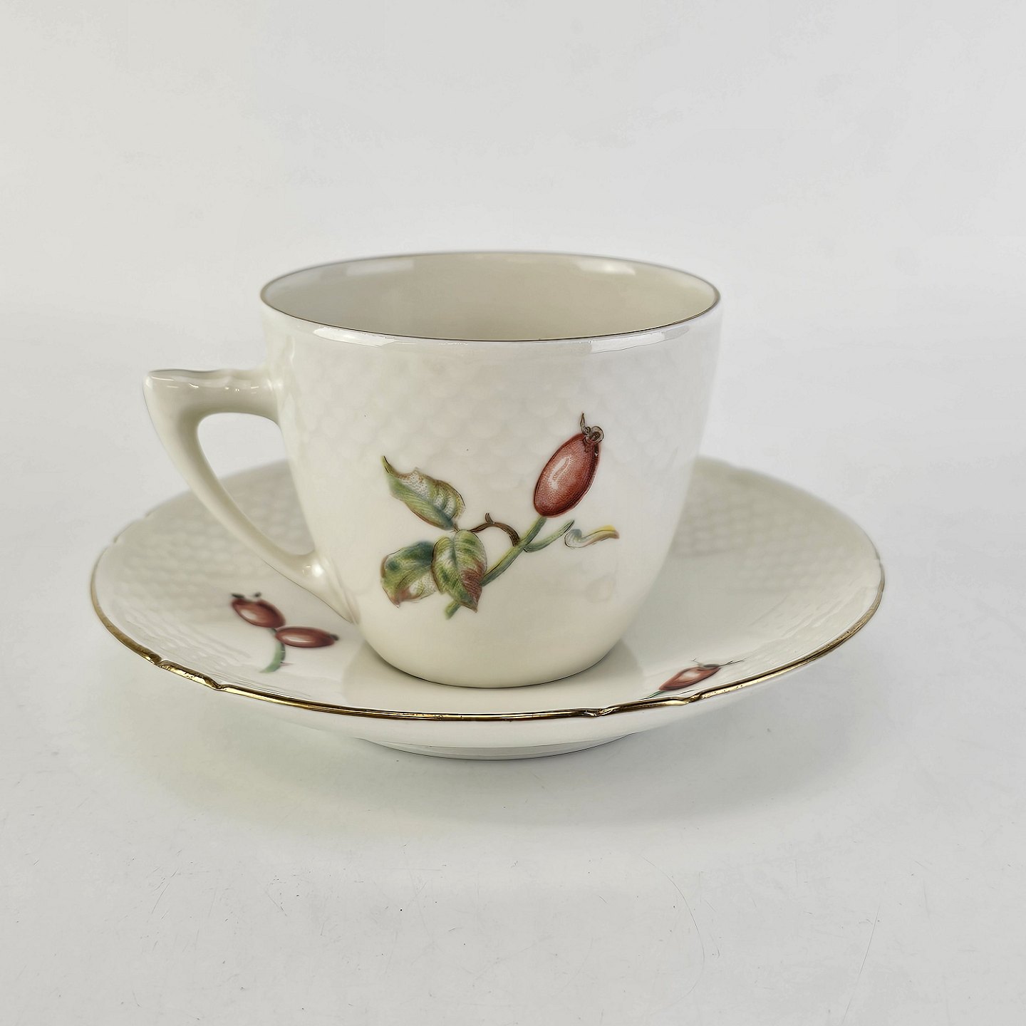 Balder er cremefarvet porcelæn i skælform, dekoreret med hyben og guldkant.