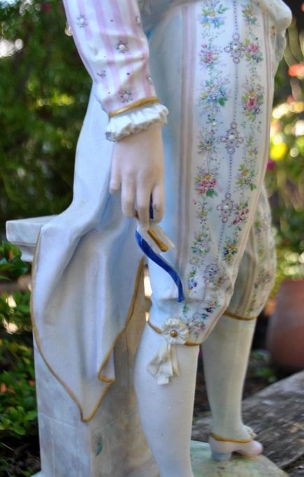 Large bisque figurine of a young man, 19th century. Armand Marseilles, Germany. Cold-painted porcelain and gilded. Stamped. H: 55.5 cm.