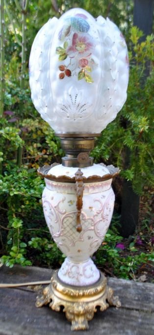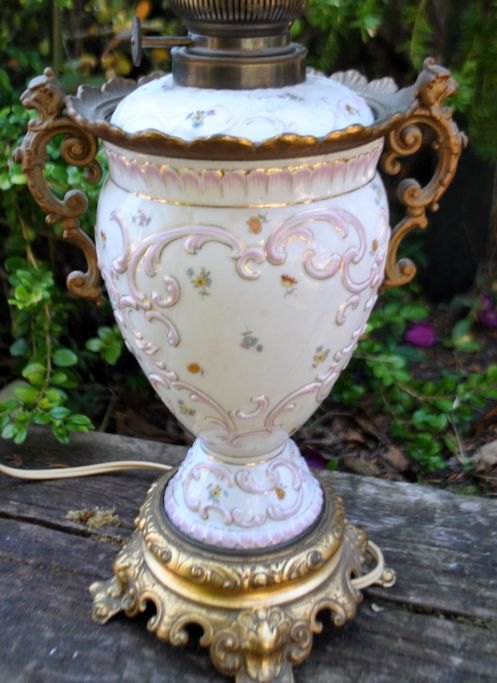 Kerosene lamp in faience and glass, converted to electricity, 19th century.