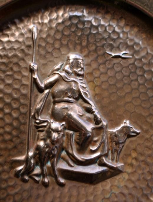 Copper dish with Odin motif, 19th century, Denmark. Motif of Odin with ravens and wolves. Viking ornamentation on the edge. Unmarked. Diameter: 42 cm.