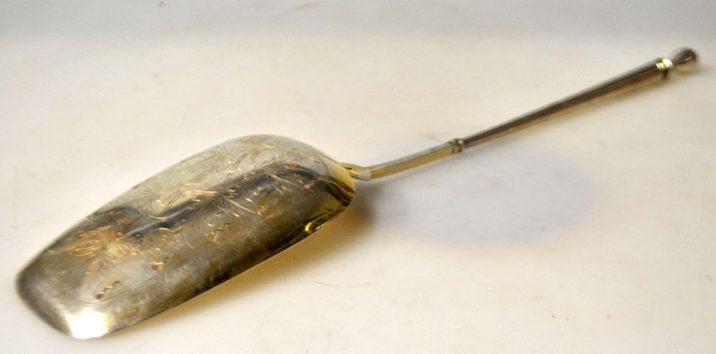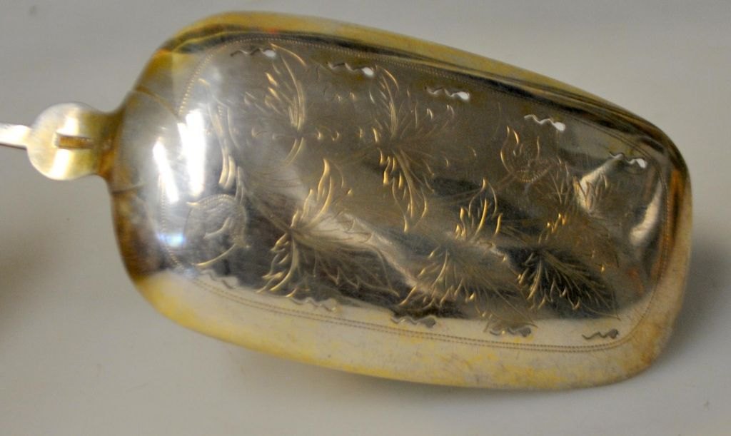 Danish master-stamped strawberry spoon, 19th century. Gilded base and engraved with strawberries. Smooth handle. Unclear master stamp. L 28 cm.