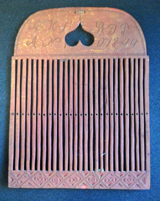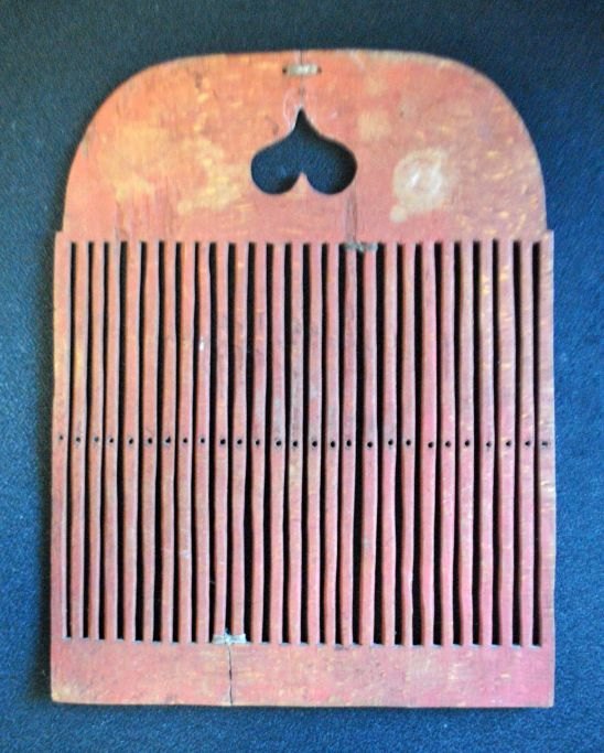 Antique Danish weaving heddle in red painted beech, 1844. With carved heart and the intivals: AKS / RDJ 27.5 x 21.5 cm.