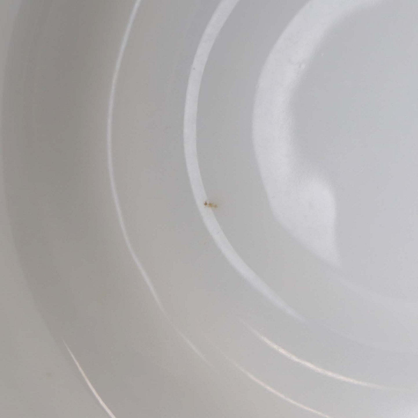 Mellemstørrelse urtepotteskjuler i glat hvidt porcelæn dekoreret med blå striber. Nr. 1855/6103