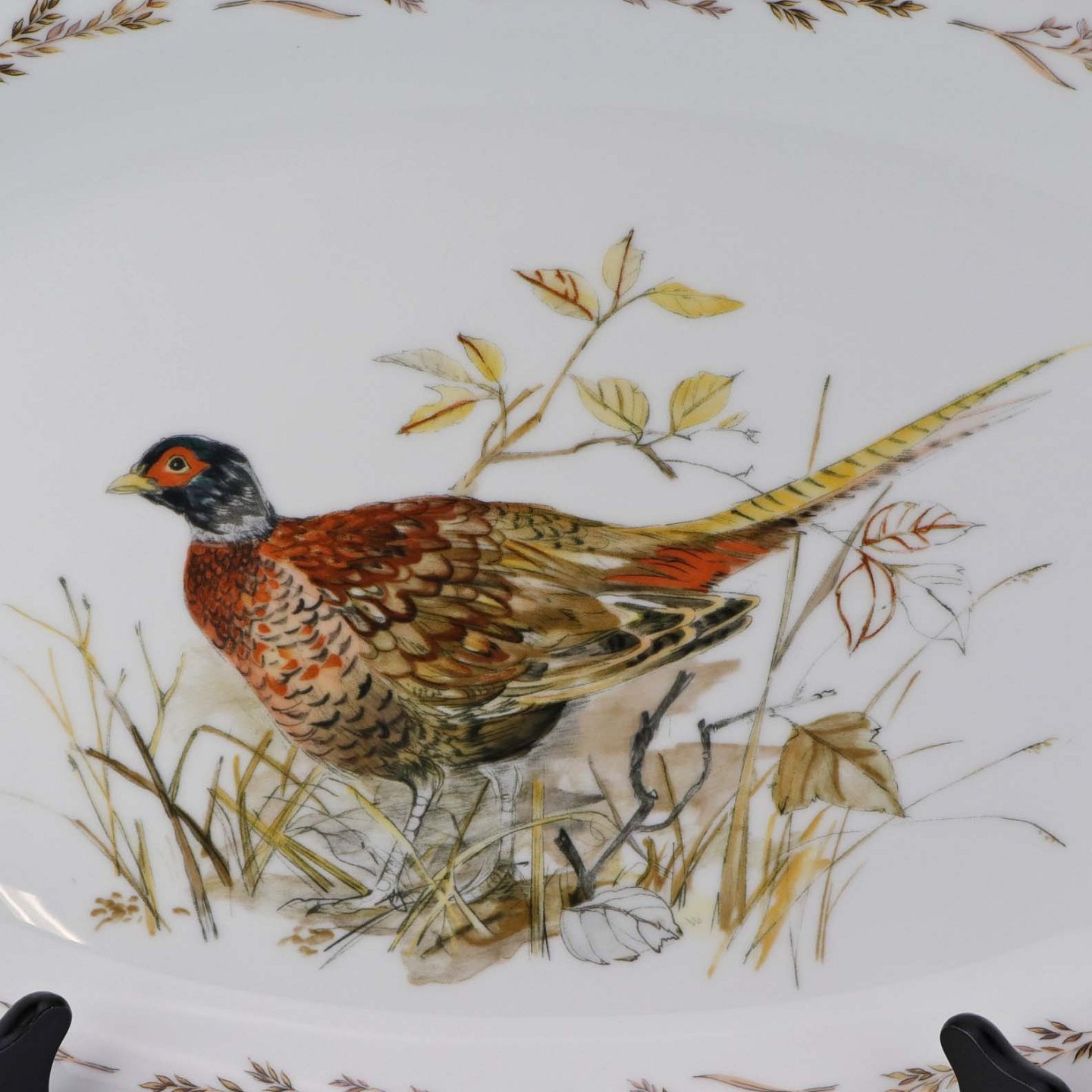 Text available in Danish: Ovalt serveringsfad i porcelæn med motiv af fasan fra stellet Jagtstel. Nr. 35
