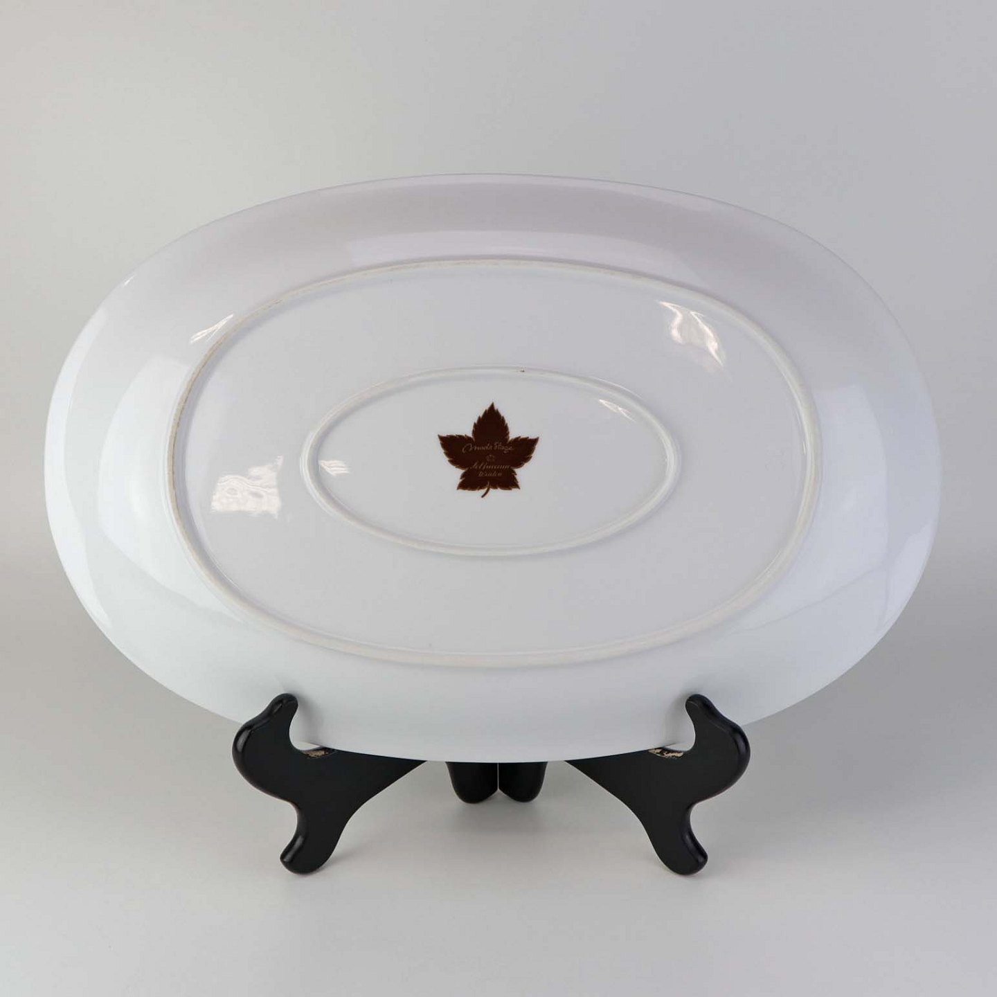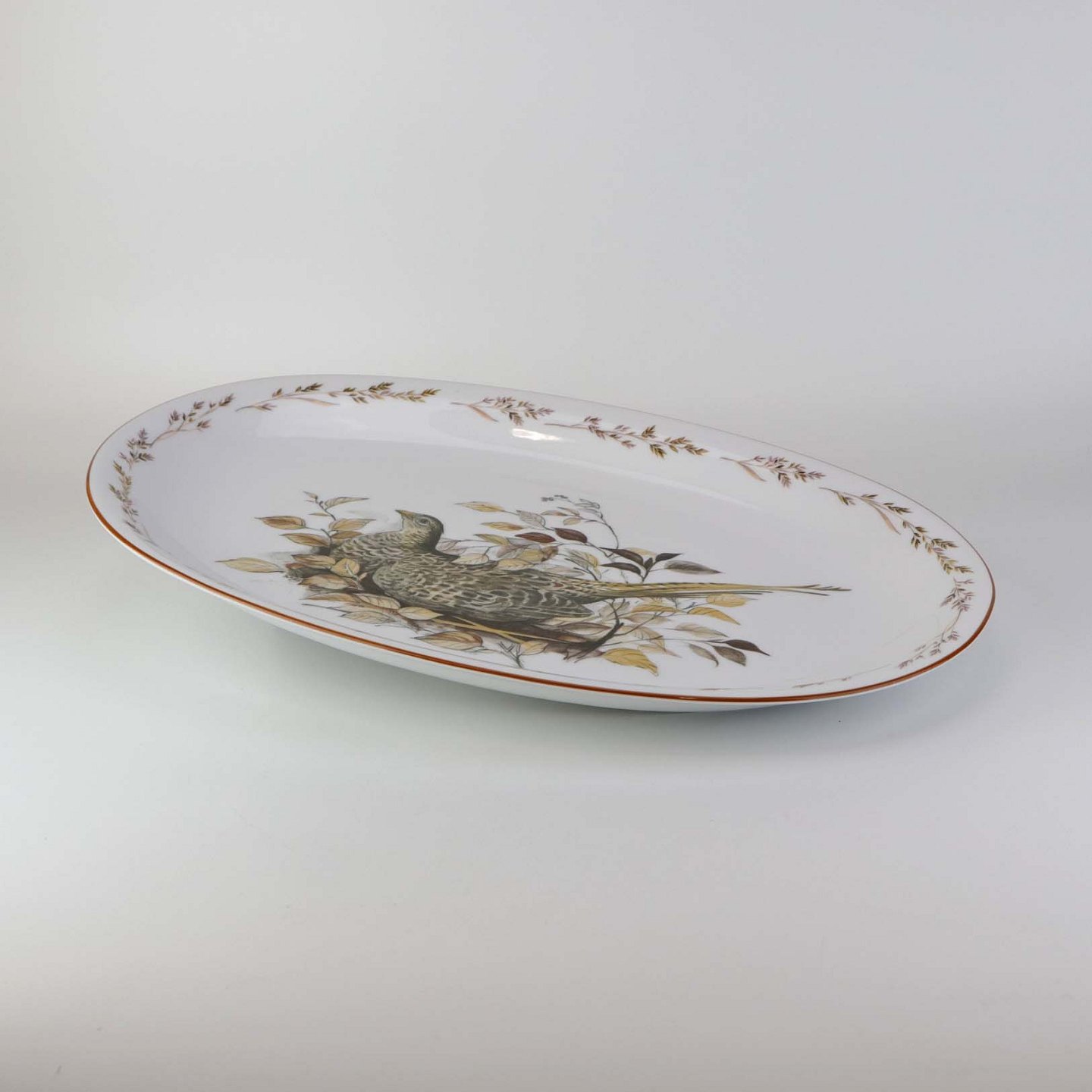 Text available in Danish: Ovalt serveringsfad i porcelæn med motiv af agerhøne på rede fra stellet Jagtstel. Nr. 38
