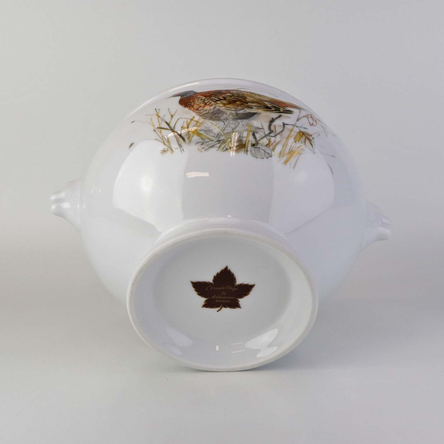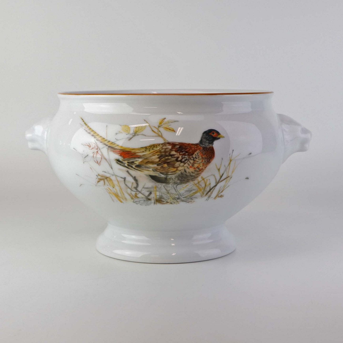 Text available in Danish: Rund skål på fod i porcelæn med hanke af grævlingehoveder og med motiv af fasan fra stellet Jagtstel. Nr. 2
