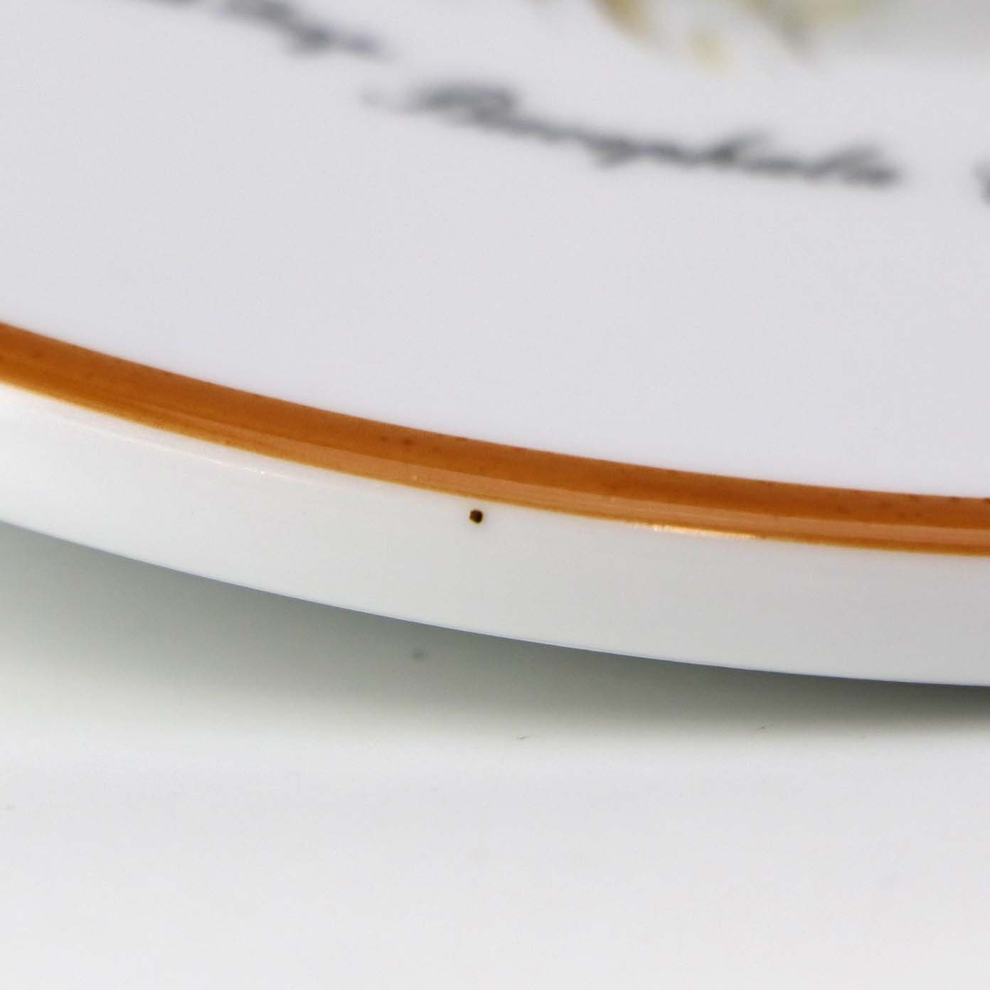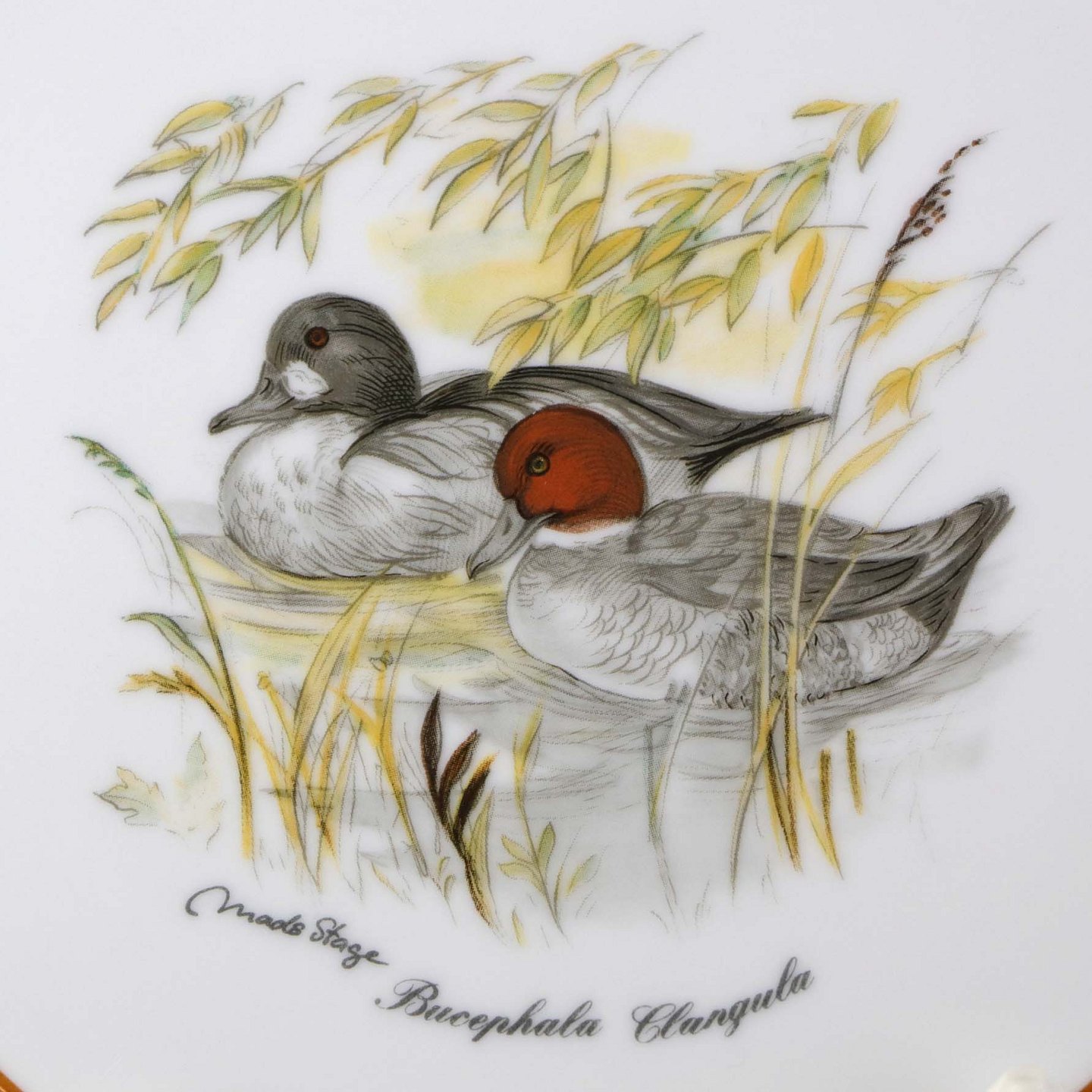 Text available in Danish: Rund smørbrik i porcelæn med forboret hul til ophæng og motiv af ænder fra stellet Jagtstel.