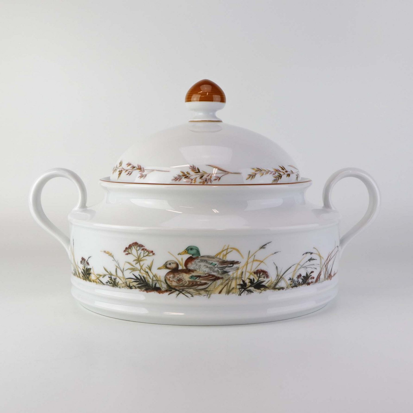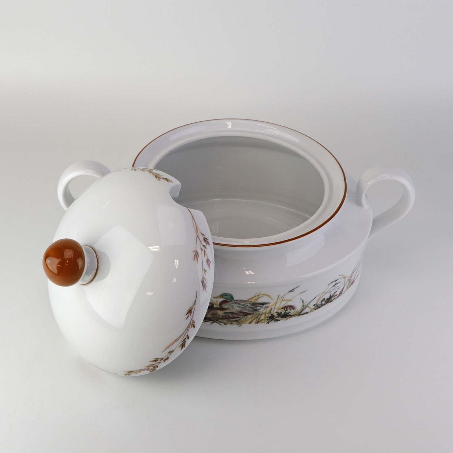 Text available in Danish: Ragout fad i porcelæn med låg og hanke, som er dekoreret med motiv af ænder fra stellet Jagtstel.