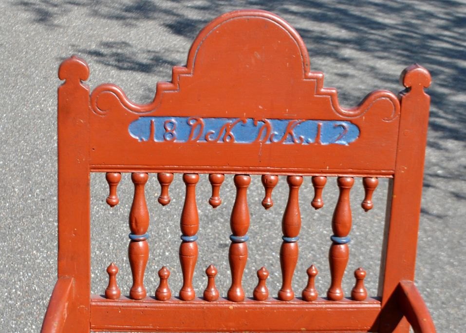 Armchair of painted beech wood 1812. Denmark. Painted red. 5-part slatted back. The back is carved with the initials: DN DK 1812. H.: 106 cm. W.: 67 cm. D.: 39.5 cm.