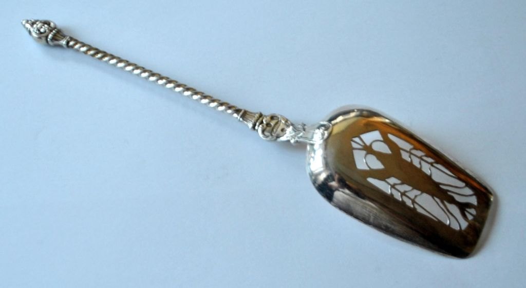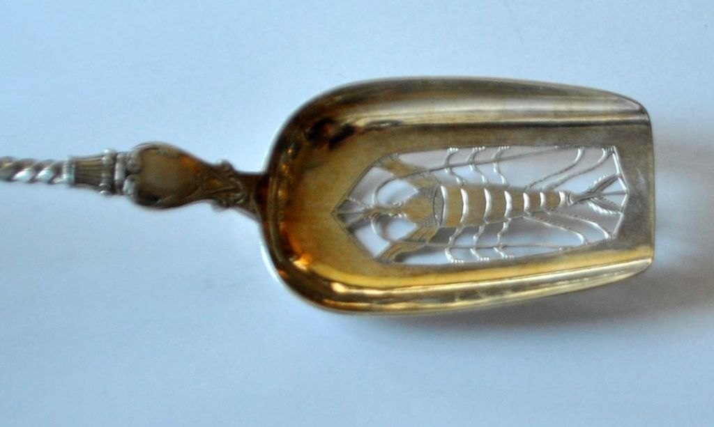 Silver crab spoon, Copenhagen, 1869. Unidentifiable master's mark. With city coat of arms and guardein mark. Handle with crab and interior gilding. Twisted handle with angel head. L: 22 cm.