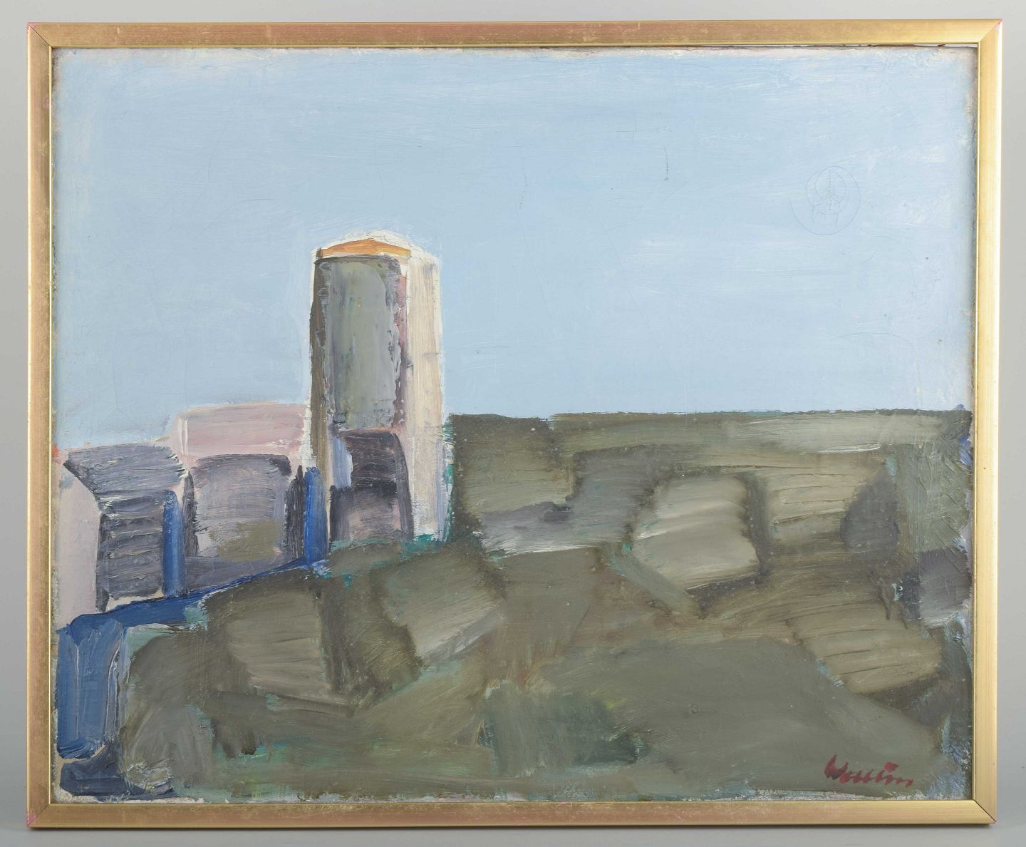 A modernist landscape painting with geometric-abstract forms and a monumental building placed centrally in the composition. The broad brushstrokes and muted colors emphasize the textural and architectural qualities of the work.