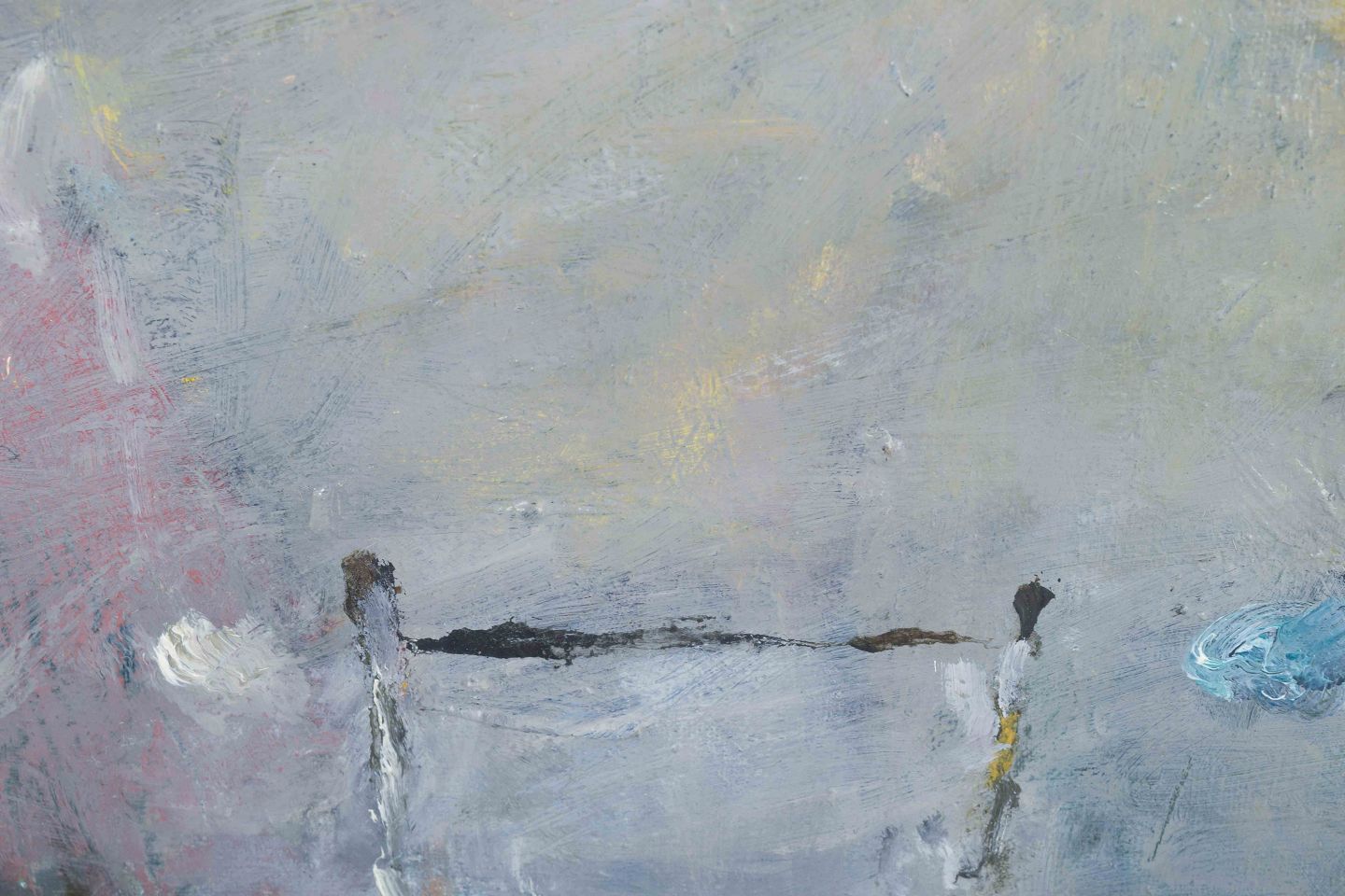 An atmospheric abstract painting with suggestive features, where a gate in the foreground opens onto a misty landscape. The color palette is dominated by subdued shades of grey, blue, and violet, accented with touches of yellow and red, giving the composition a dreamlike and poetic quality.