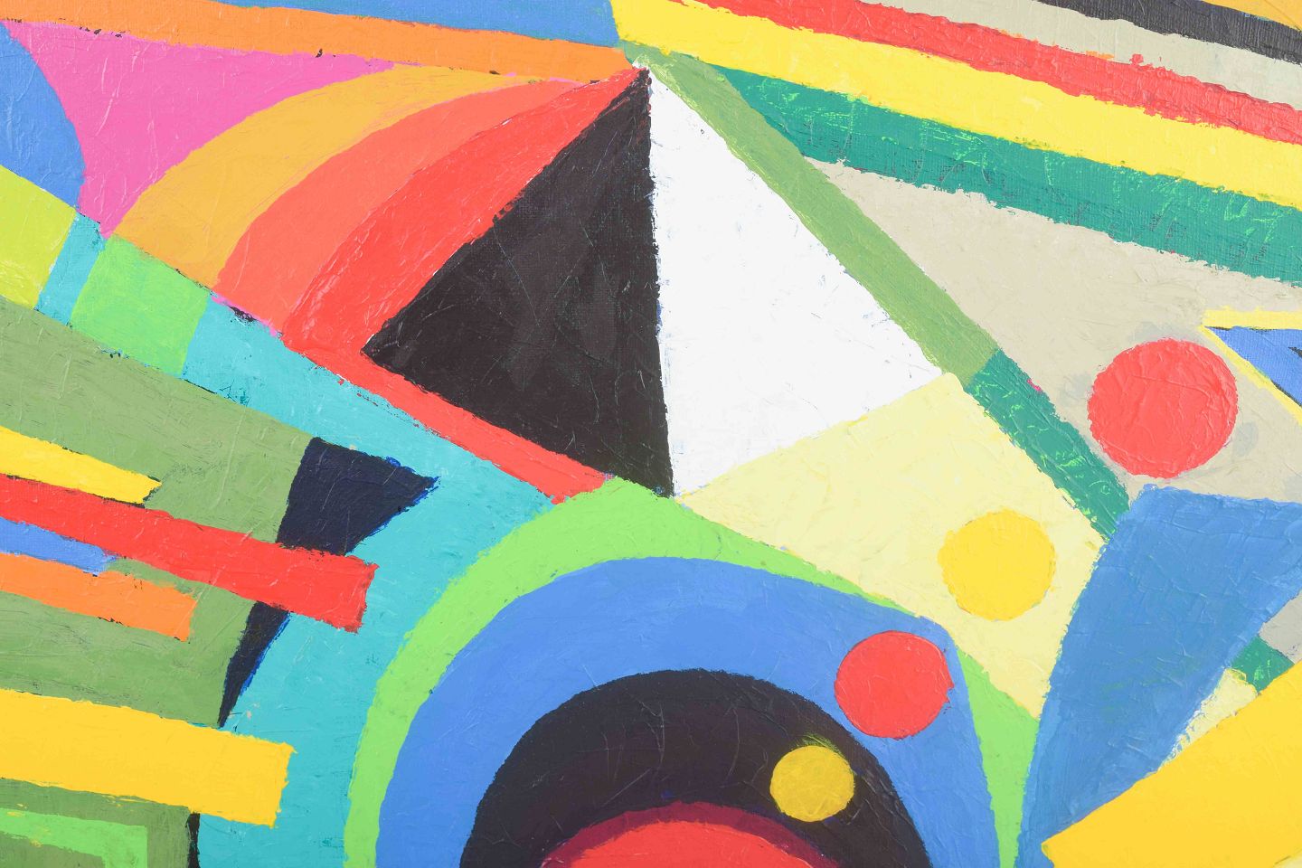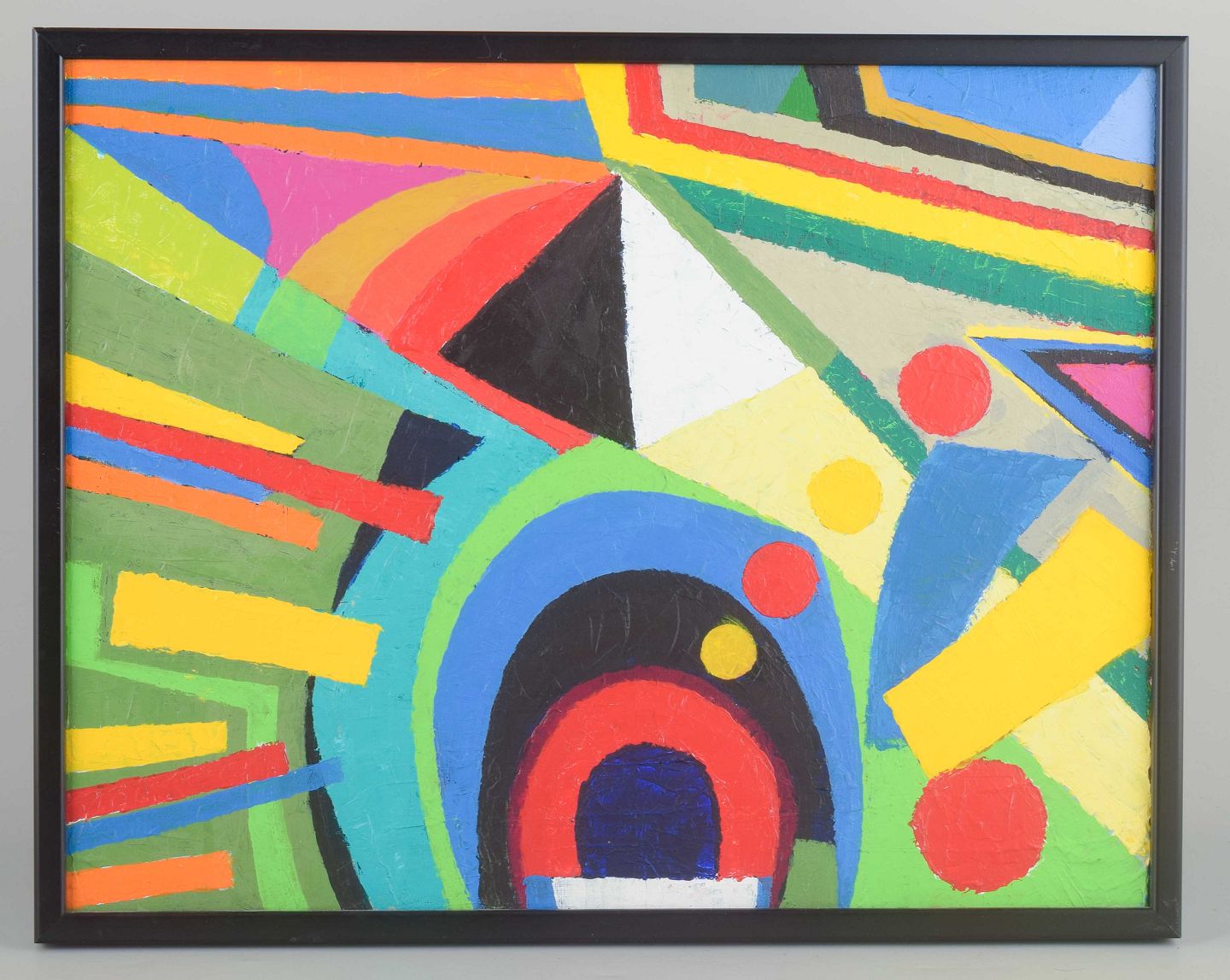 A coloristically strong and geometrically precise work, where circles, arches, and lines in vivid primary and secondary colors create a dynamic whole. The composition reflects the concrete and constructivist visual language of the 1970s, with color and form as its central means of expression.