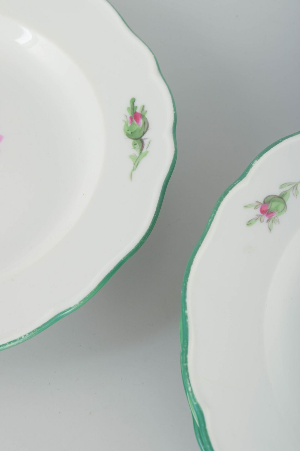 Set of four porcelain plates decorated with hand-painted pink roses and green rim. Marked with the Meissen crossed swords under the base.