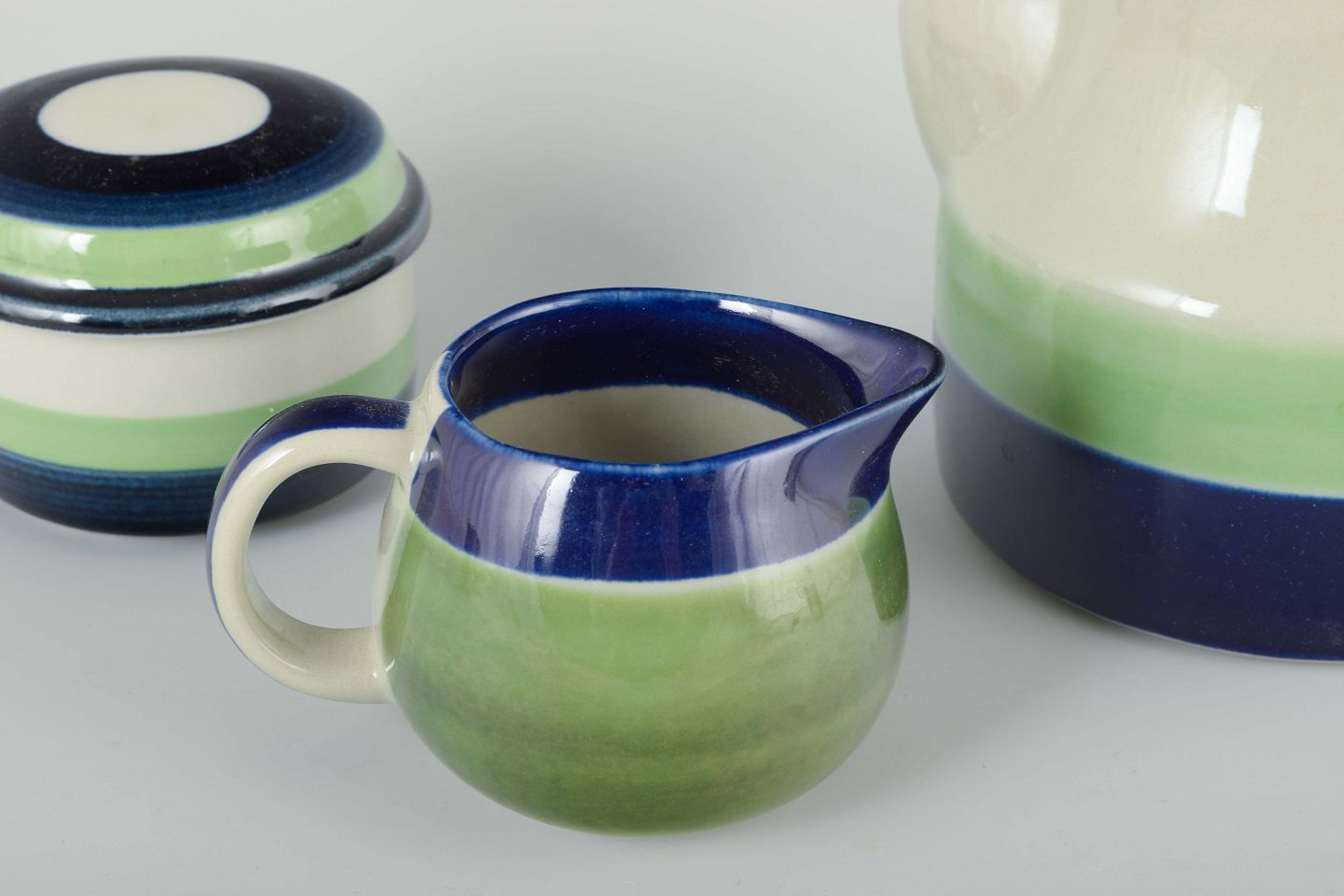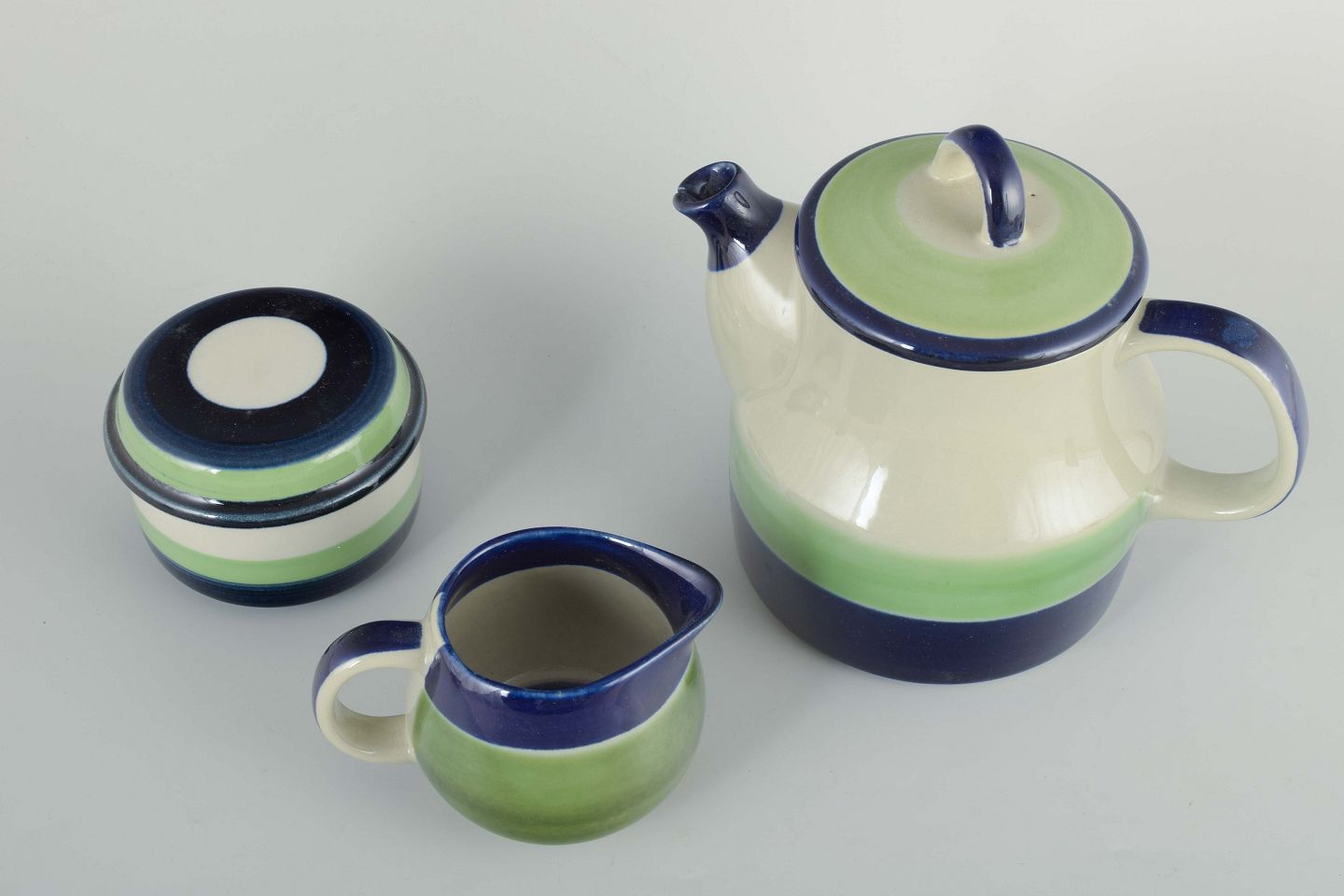 Set consisting of a coffee pot, sugar bowl and cream jug in faience with white glaze, green and blue decoration.