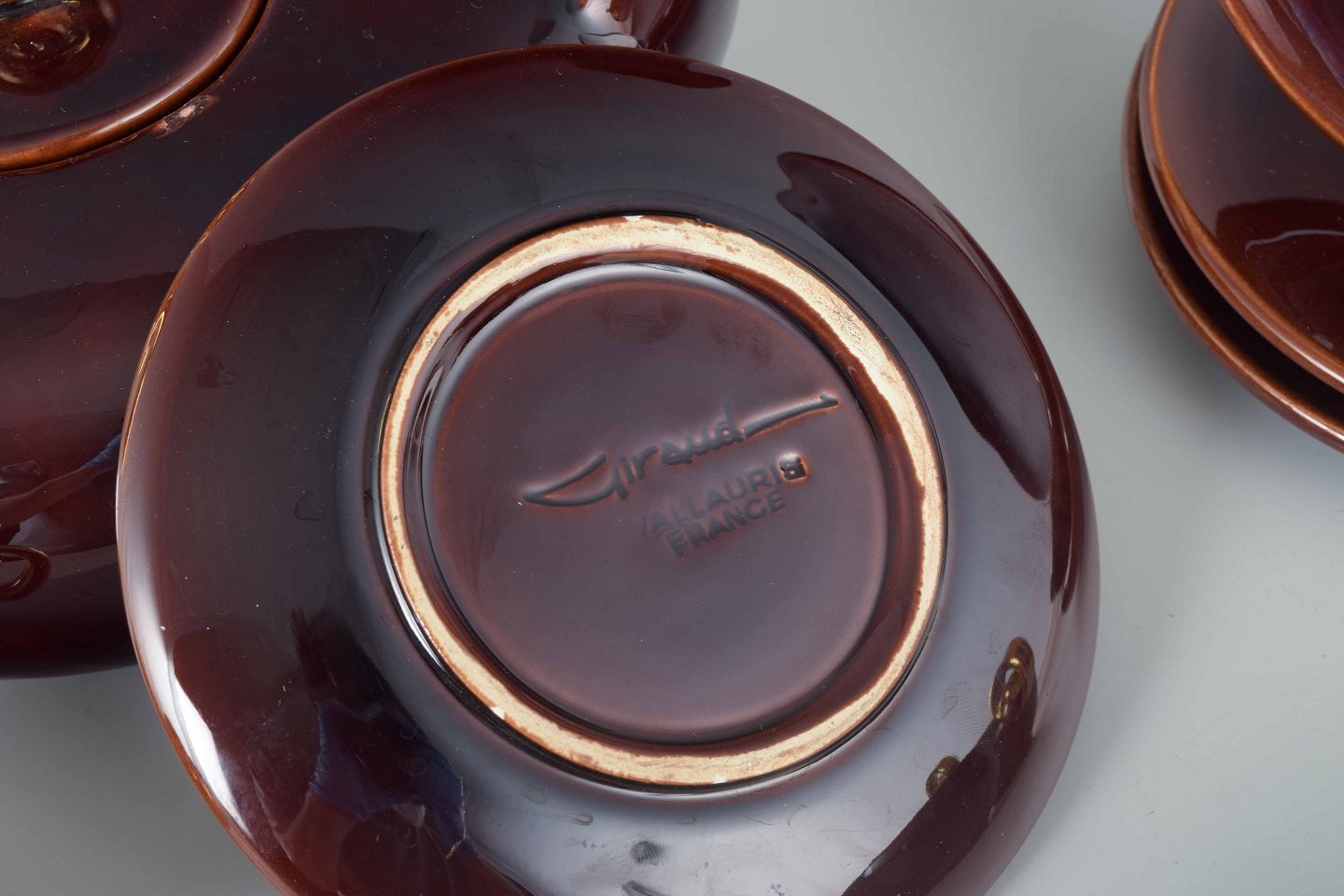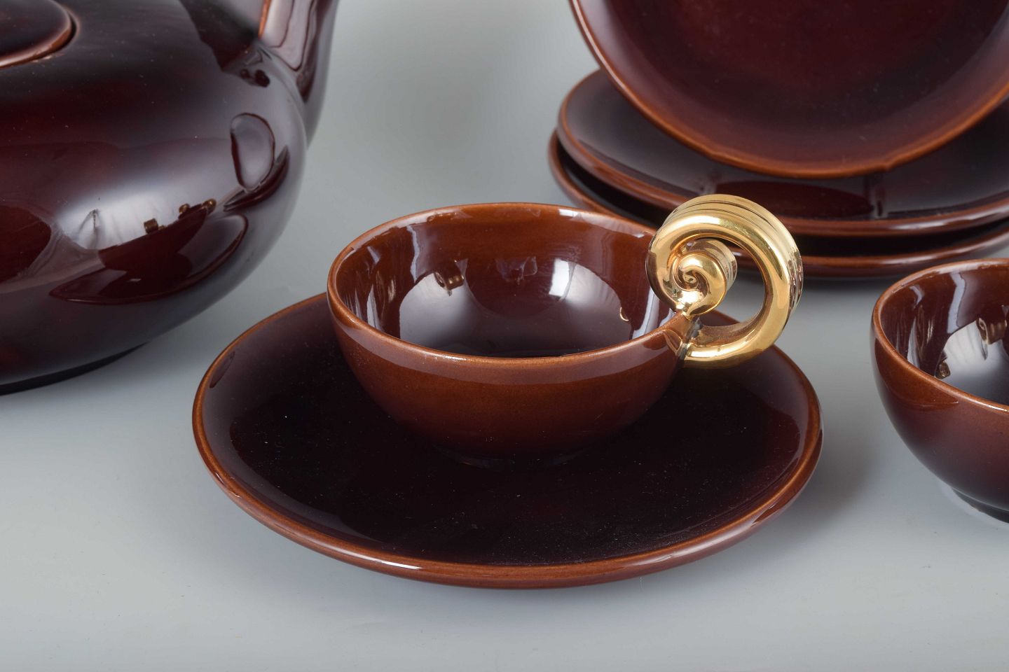 Tea set in glazed ceramic with a deep burgundy color and distinctive handles in gilded ceramic. Comprising teapot, four cups with saucers, and four plates.