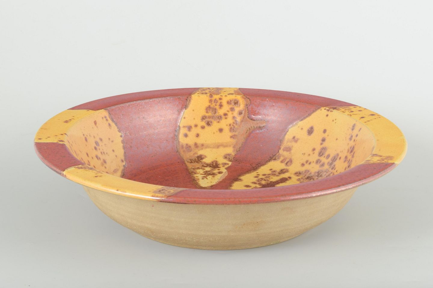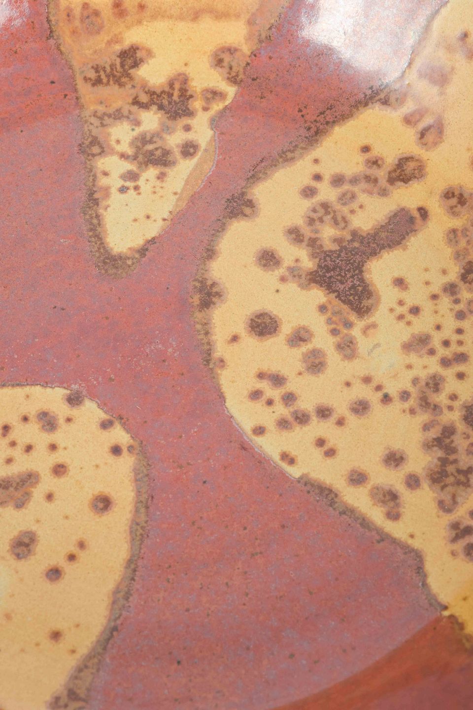 Wheel-thrown stoneware bowl with reddish-brown base glaze and decorative yellow speckled patches in an organic, abstract pattern. Indistinctly signed to the underside.