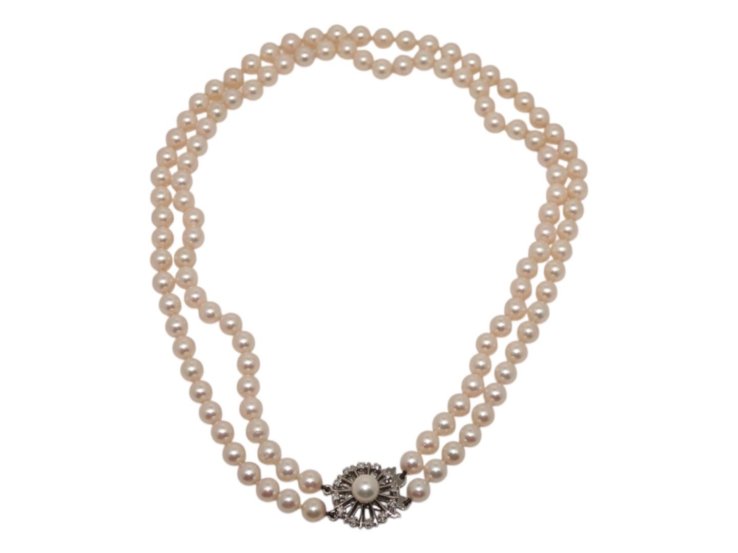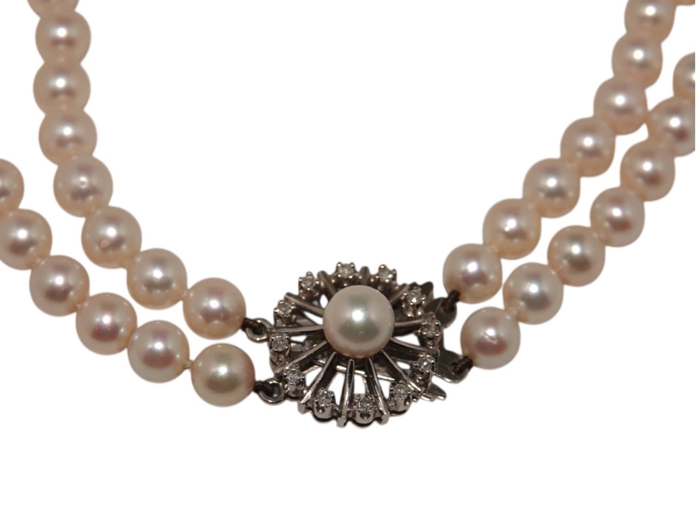 Double row pink Akoya pearl necklace with 14 carat white gold pendant with diamonds.
