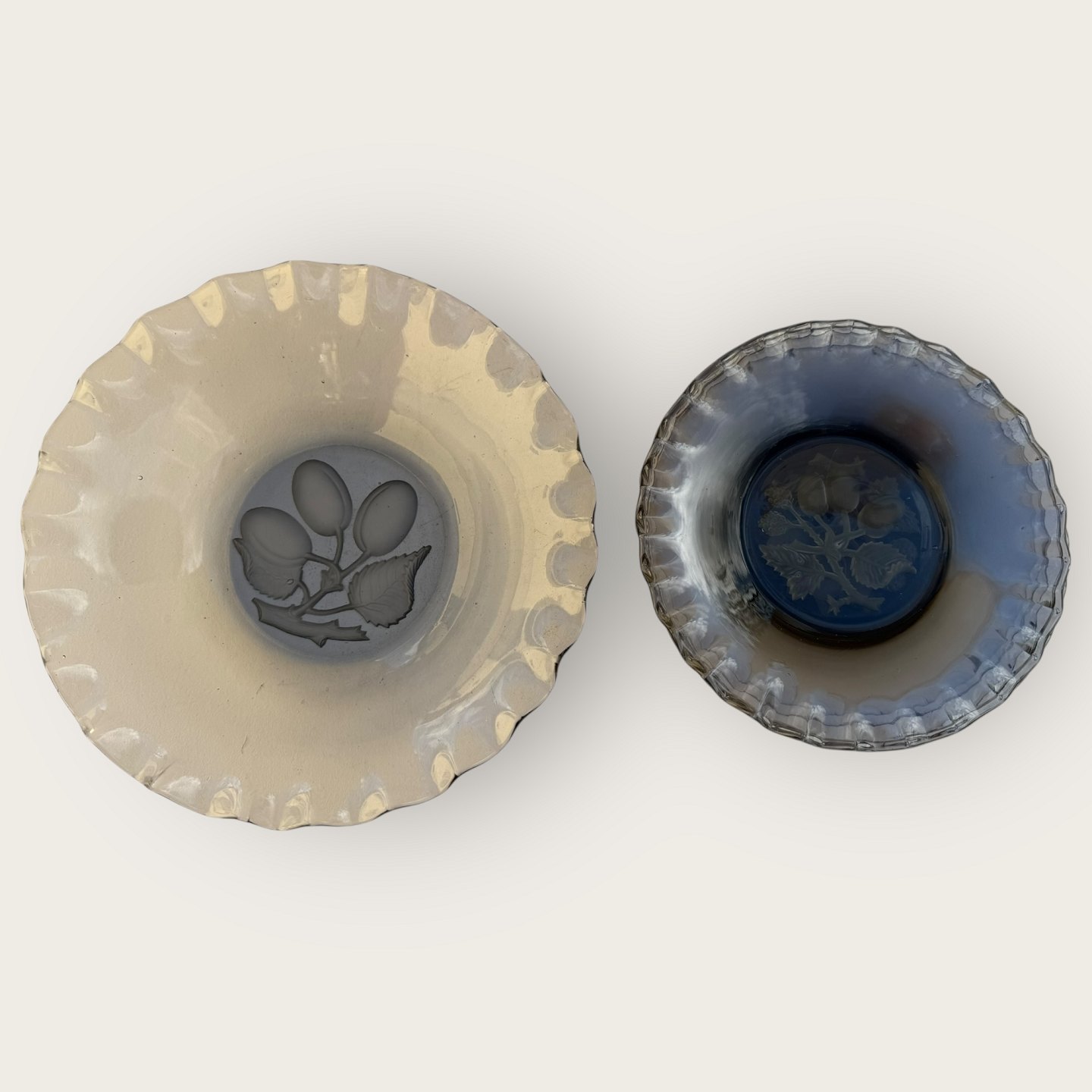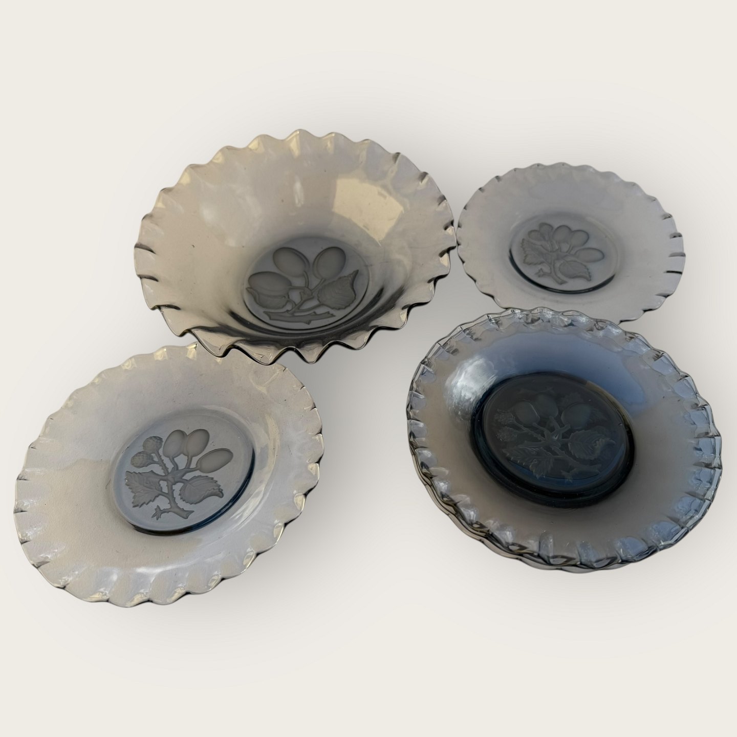Glass bowl and 6 dessert plates with flower / fruit motif, frilled edge made of gray-toned glass, bowl diameter 21cm, height 5.5cm, plates diameter 16.5cm, *fine condition*