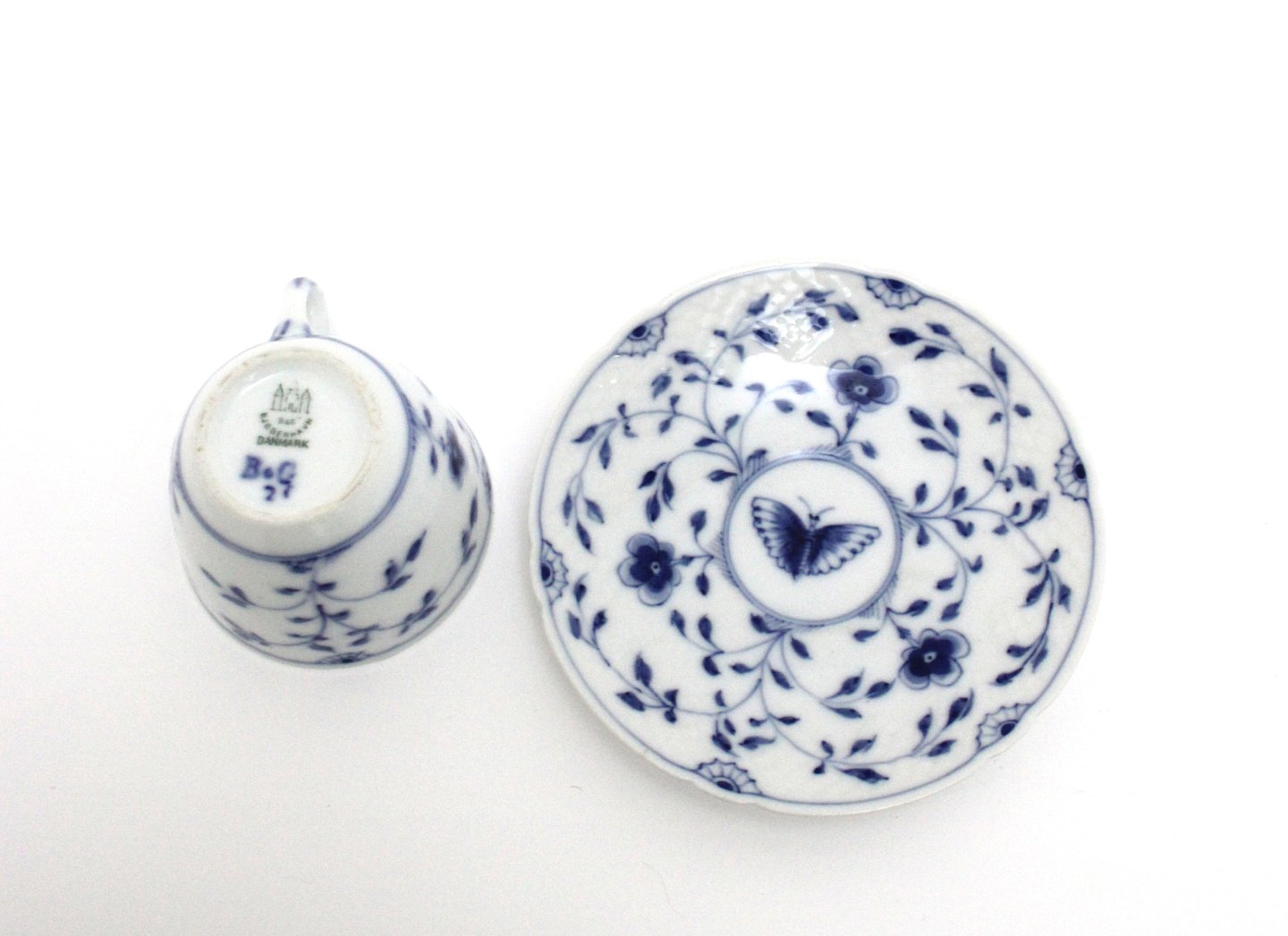 Bing & Grøndahl, Sommerfugl, Kaffekop med underkop. Produceret i perioden 1915-1948. Højde ca. 6 cm. Diameter 8 cm. Underkop diameter 13,5 cm. I. og II sortering. Pris: 150 kr. stk. Lager: 11